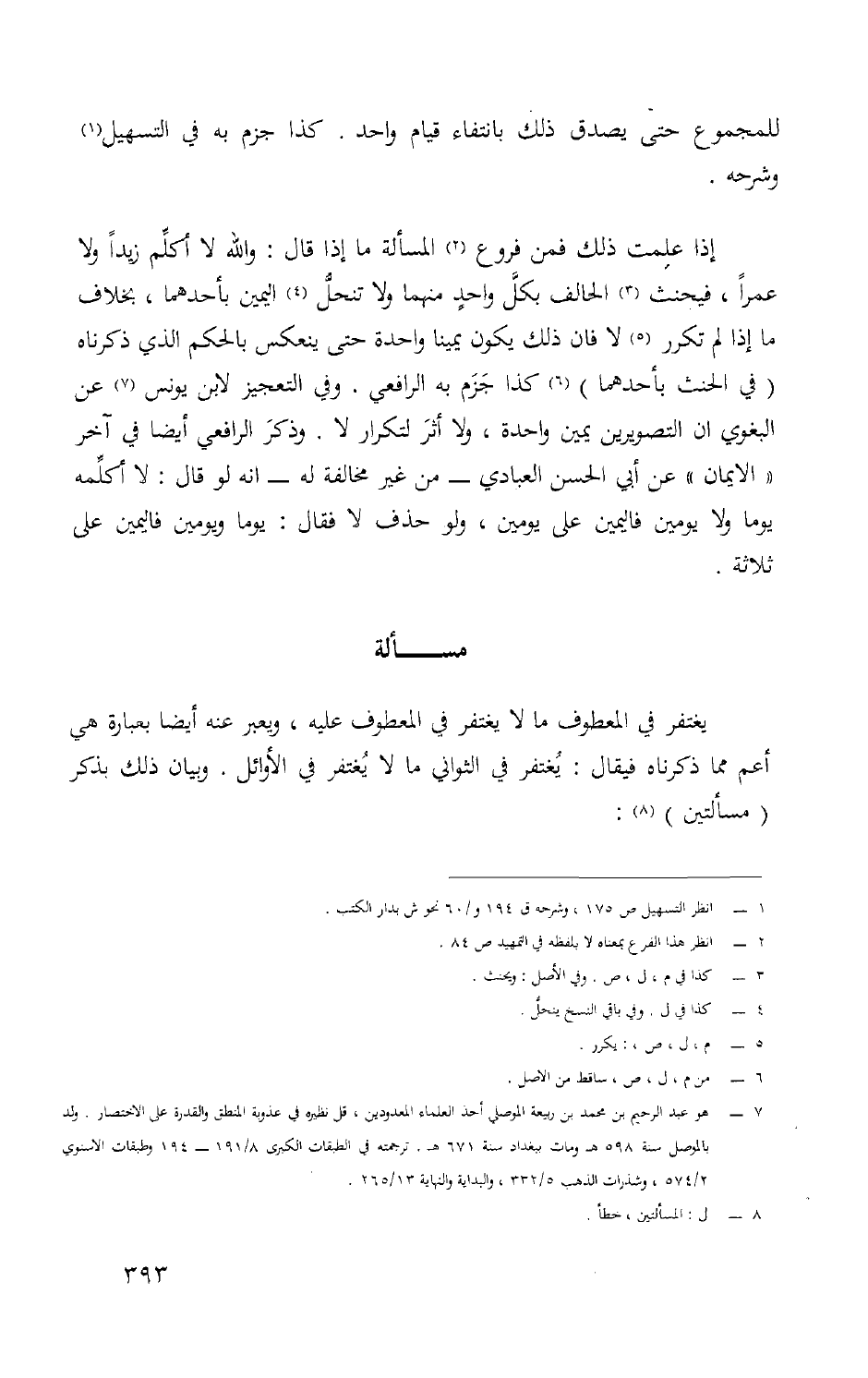 إِذا علمت ذَلِك فَمن فروع الْمَسْأَلَة مَا إِذا قَالَ وَالله لَا أكلم زيدا وَلَا عمرا فَيحنث الْحَالِف بِكُل وَاحِد مِنْهُمَا وَلَا تنْحَل الْيَمين بِأَحَدِهِمَا بِخِلَاف مَا إِذا لم تكَرر لَا فَإِن ذَلِك يكون يَمِينا وَاحِدَة حَتَّى ينعكس بالحكم الَّذِي ذَكرْنَاهُ فِي الْحِنْث بِأَحَدِهِمَا كَذَا جزم بِهِ الرَّافِعِيّ وَفِي التَّعْجِيز لِابْنِ يُونُس عَن الْبَغَوِيّ أَن التصويرين يَمِين وَاحِدَة وَلَا أثر لتكرار لَا وَذكر الرَّافِعِيّ أَيْضا فِي آخر الايمان عَن أبي الْحسن الْعَبَّادِيّ من غير مُخَالفَة لَهُ أَنه لَو قَالَ لَا ُأكَلِّمهُ يَوْمًا وَلَا يَوْمَيْنِ فاليمين على يَوْمَيْنِ وَلَو حذف لَا فَقَالَ يَوْمًا ويومين فاليمين على ثَلَاثَة