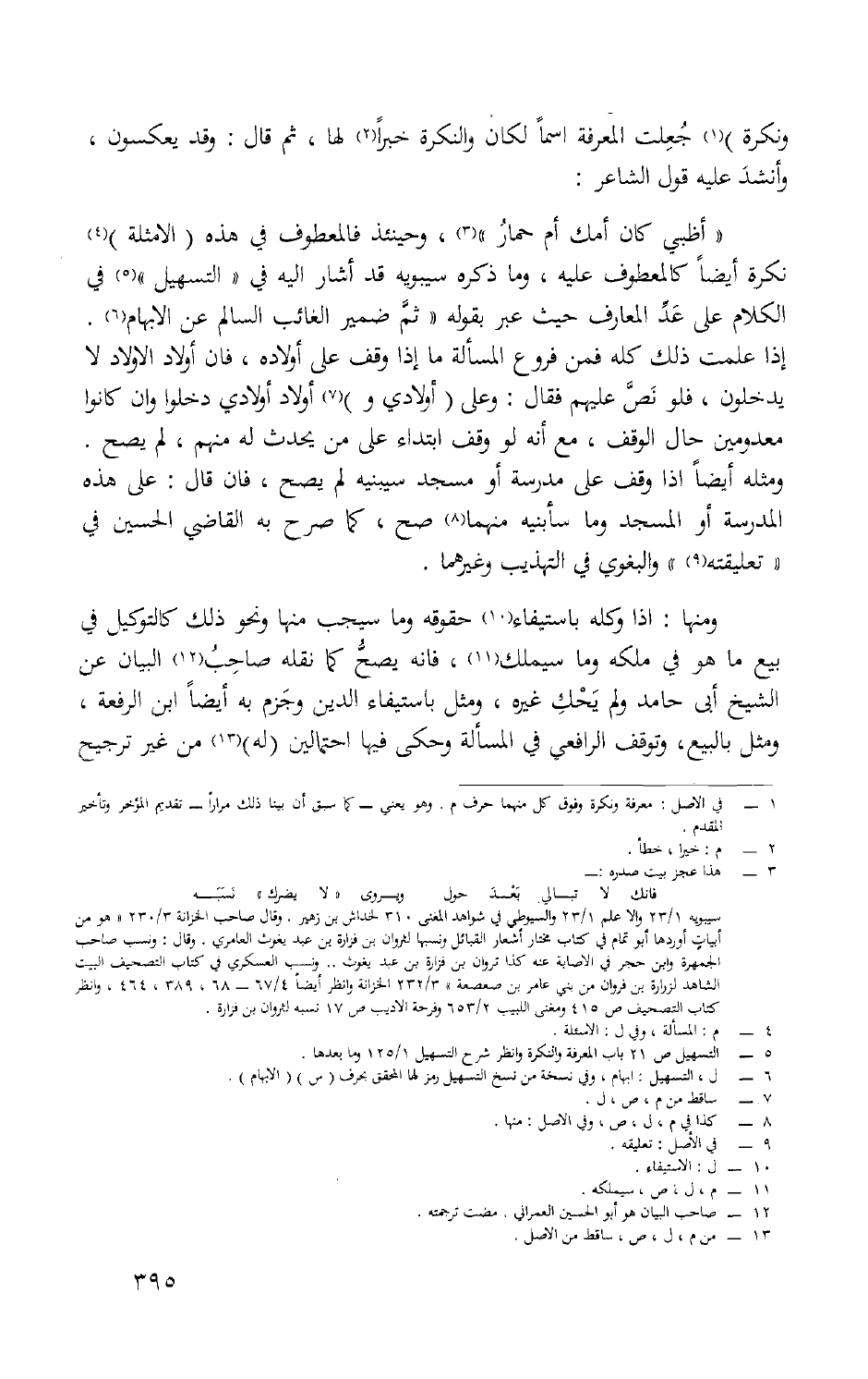 ونكرة جعلت الْمعرفَة اسْما لَكَانَ والنكرة خَبرا لَهَا ثمَّ قَالَ وَقد يعكسون وَأنْشد عَلَيْهِ قَول الشَّاعِر ... أظبي كَانَ أمك أم حمَار ... وَحِينَئِذٍ فالمعطوف فِي هَذِه الْأَمْثِلَة نكرَة أَيْضا كالمعطوف عَلَيْهِ وَمَا ذكره سِيبَوَيْهٍ قد أَشَارَ إِلَيْهِ فِي التسهيل فِي الْكَلَام على عد المعارف حَيْثُ عبر بقوله ثمَّ ضمير الْغَائِب السَّالِم عَن الْإِبْهَام إِذا علمت ذَلِك كُله فَمن فروع الْمَسْأَلَة مَا إِذا وقف على أَوْلَاده فَإِن أَوْلَاد الْأَوْلَاد لَا يدْخلُونَ فَلَو نَص عَلَيْهِم فَقَالَ وعَلى أَوْلَادِي أَوْلَادِي أوادي دخلُوا وَإِن كَانُوا معدومين حَال الْوَقْف مَعَ أَنه لَو وقف ابْتِدَاء على من يحدث لَهُ مِنْهُم لم يَصح وَمثله أَيْضا إِذا وقف على مدرسة أَو مَسْجِد سيبنيه لم يَصح فَإِن قَالَ على هَذِه الْمدرسَة أَو الْمَسْجِد وَمَا سأبنيه مِنْهُمَا صَحَّ كَمَا صرح بِهِ القَاضِي الْحُسَيْن فِي تعليقته وَالْبَغوِيّ فِي التَّهْذِيب وَغَيرهمَا