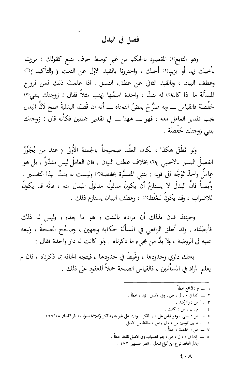 وَهُوَ التَّابِع الْمَقْصُود بالحكم من غير توَسط حرف مُتبع كَقَوْلِك مَرَرْت بأخيك زيد أَو بزيد أَخِيك واحترزنا بالقيد الأول عَن النَّعْت والتأكيد وَعطف الْبَيَان وبالقيد الثَّانِي عَن عطف النسف إِذا علمت ذَلِك فَمن فروع الْمَسْأَلَة مَا إِذا كَانَ لَهُ بنت وَاحِدَة اسْمهَا زَيْنَب مثلا فَقَالَ زَوجتك بِنْتي حَفْصَة فَالْقِيَاس وَبِه صرح بَعْص النُّحَاة أَنه إِن قصد الْبَدَلِيَّة صَحَّ لِأَن الْبَدَل يحب تَقْدِير الْعَامِل مَعَه فَهُوَ هَهُنَا فِي تَقْدِير جملتين فَكَأَنَّهُ قَالَ زَوجتك بِنْتي زَوجتك حَفْصَة