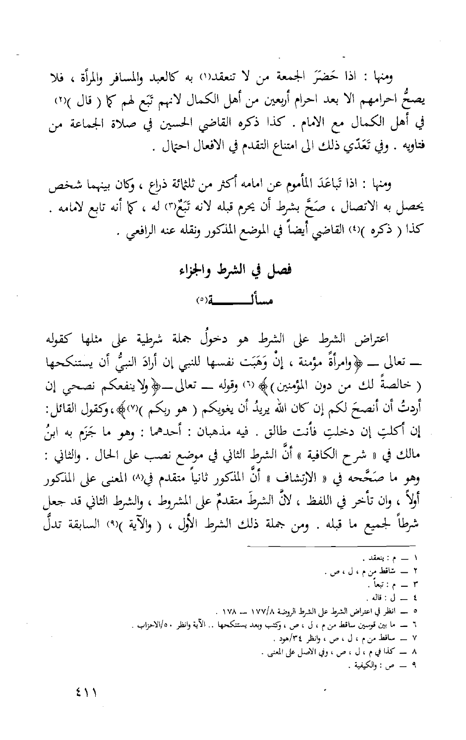 إعتراض الشَّرْط على الشَّرْط هُوَ دُخُول جملَة شَرْطِيَّة على مثلهَا كَقَوْلِه تعاى {وَامْرَأَة مُؤمنَة إِن وهبت نَفسهَا للنَّبِي إِن أَرَادَ النَّبِي أَن يستنكحها خَالِصَة لَك من دون الْمُؤمنِينَ} وَقَوله تَعَالَى {وَلَا ينفعكم نصحي إِن أردْت أَن أنصح لكم إِن كَانَ الله يُرِيد أَن يغويكم هُوَ ربكُم} وكقول الْقَائِل إِن أكلت إِن دخلت فَأَنت طَالِق فِيهِ مذهبان احدهما وَهُوَ مَا جزم بِهِ ابْن مَالك فِي شرح الكافية أَن الشَّرْط الثَّانِي فِي مَوضِع نصب على الْحَال وَالثَّانِي وَهُوَ مَا صَححهُ فِي الارتشاف أَن الْمَذْكُور ثَانِيًا مُتَقَدم فِي الْمَعْنى على الْمَذْكُور أَولا وَإِن تَأَخّر فِي اللَّفْظ لِأَن الشَّرْط مُتَقَدم على الْمَشْرُوط وَالشّرط الثَّانِي قد جعل شرطا لجَمِيع مَا قبله وَمن جملَة ذَلِك الشَّرْط الأول وَالْآيَة السَّابِقَة تدل