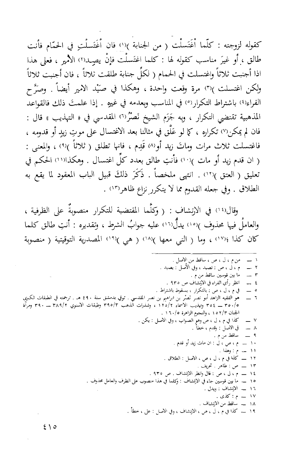 كَقَوْلِه لزوجته كلما اغْتَسَلت من الْجَنَابَة فان اغْتَسَلت فِي الْحمام فَأَنت طَالِق أَو غير مُنَاسِب كَقَوْلِه لَهَا كلما اغْتَسَلت فان يصد الْأَمِير فعلى هَذَا إِذا أجنبت ثَلَاثًا وَاغْتَسَلت فِي الْحمام لكل جَنَابَة طلقت ثَلَاثًا فان اجنبت ثَلَاثًا وَلَكِن اغْتَسَلت مرّة وَقعت وَاحِدَة وَهَكَذَا فِي صيد الْأَمِير أَيْضا وَصرح الْفراء بِاشْتِرَاط التّكْرَار فِي الْمُنَاسب وبعدمه فِي غَيره إِذا علمت ذَلِك فالقواعد المذهبية تَقْتَضِي التّكْرَار وَبِه جزم الشَّيْخ نصر الْمَقْدِسِي فِي التَّهْذِيب قَالَ فان لم يكن تكراره كَمَا لَو علق فِي مثالنا بعد الِاغْتِسَال على موت زيد أَو قدومه فاغتسلت ثَلَاث مَرَّات وَمَات زيد أَو قدم فانها تطلق ثَلَاثًا وَالْمعْنَى إِن قدم زيد أَو مَاتَ فَأَنت طَالِق بِعَدَد كل إغتسال وَهَكَذَا الحكم فِي تَعْلِيق الْعتْق انْتهى مُلَخصا ذكر ذَلِك قبيل الْبَاب الْمَعْقُود لما يَقع بِهِ الطَّلَاق وَفِي جعله الْقدوم مِمَّا لَا يتَكَرَّر نزاع ظَاهر