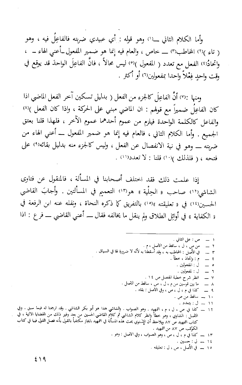 وَمِنْهَا أَن الْفَاعِل كالجزء من الْفِعْل بِدَلِيل تسكين آخر الْفِعْل الْمَاضِي اذا كَانَ الْفَاعِل ضميرا مَعَ قَوْلهم ان الْمَاضِي مَبْنِيّ على الْحَرَكَة واذا كَانَ الْفِعْل وَالْفَاعِل كالكلمة الْوَاحِدَة فَيلْزم من عُمُوم أَحدهمَا عُمُوم الآخر فَلهَذَا قُلْنَا بِعِتْق الْجَمِيع وَأما الْكَلَام الثَّانِي فالعام فِيهِ إِنَّمَا هُوَ ضمير الْمَفْعُول أَعنِي الْهَاء من ضَربته وَهُوَ فِي نِيَّة الِانْفِصَال عَن الْفِعْل وَلَيْسَ كالجزء مِنْهُ بِدَلِيل بَقَائِهِ على فَتحه فَلذَلِك قُلْنَا لَا تعدد