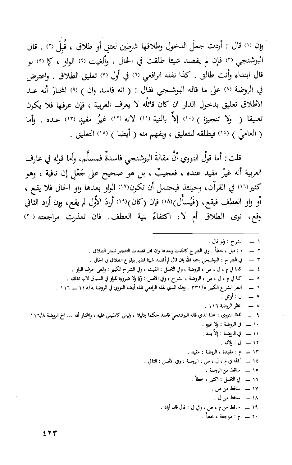 قلت أما قَول النَّوَوِيّ أَن مقَالَة البوشنجي فَاسِدَة فَمُسلم وَأما قَوْله فِي عَارِف الْعَرَبيَّة أَنه غير مُفِيد عِنْده فعجيب بل هُوَ صَحِيح على جعل إِن نَافِيَة وَهُوَ كثير فِي الْقُرْآن وَحِينَئِذٍ فَيحْتَمل أَن تكون الْوَاو بعْدهَا وَاو الْحَال فَلَا يَقع أَو وَاو الْعَطف فَيَقَع فَيسْأَل فَإِن كَانَ أَرَادَ الأول لم يَقع وَإِن أَرَادَ الثَّانِي وَقع نوى الطَّلَاق أم لَا اكْتِفَاء بنية الْعَطف فَإِن تَعَذَّرَتْ مُرَاجعَته