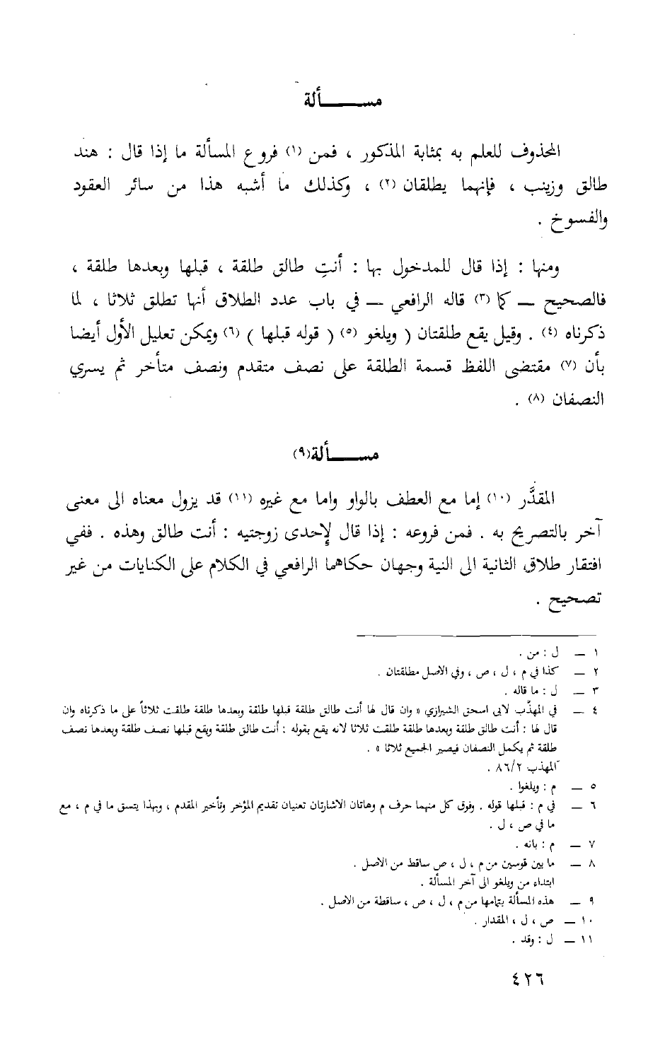 الْمُقدر إِمَّا مَعَ الْعَطف بِالْوَاو وَإِمَّا مَعَ غَيره قد يَزُول مَعْنَاهُ إِلَى معنى آخر بالتصريح بِهِ فَمن فروعه إِذا قَالَ لإحدى زوجتيه أَنْت طَالِق وَهَذِه فَفِي افتقار طَلَاق الثَّانِيَة إِلَى النِّيَّة وَجْهَان حَكَاهُمَا الرَّافِعِيّ فِي الْكَلَام على الْكِنَايَات من غير تَصْحِيح