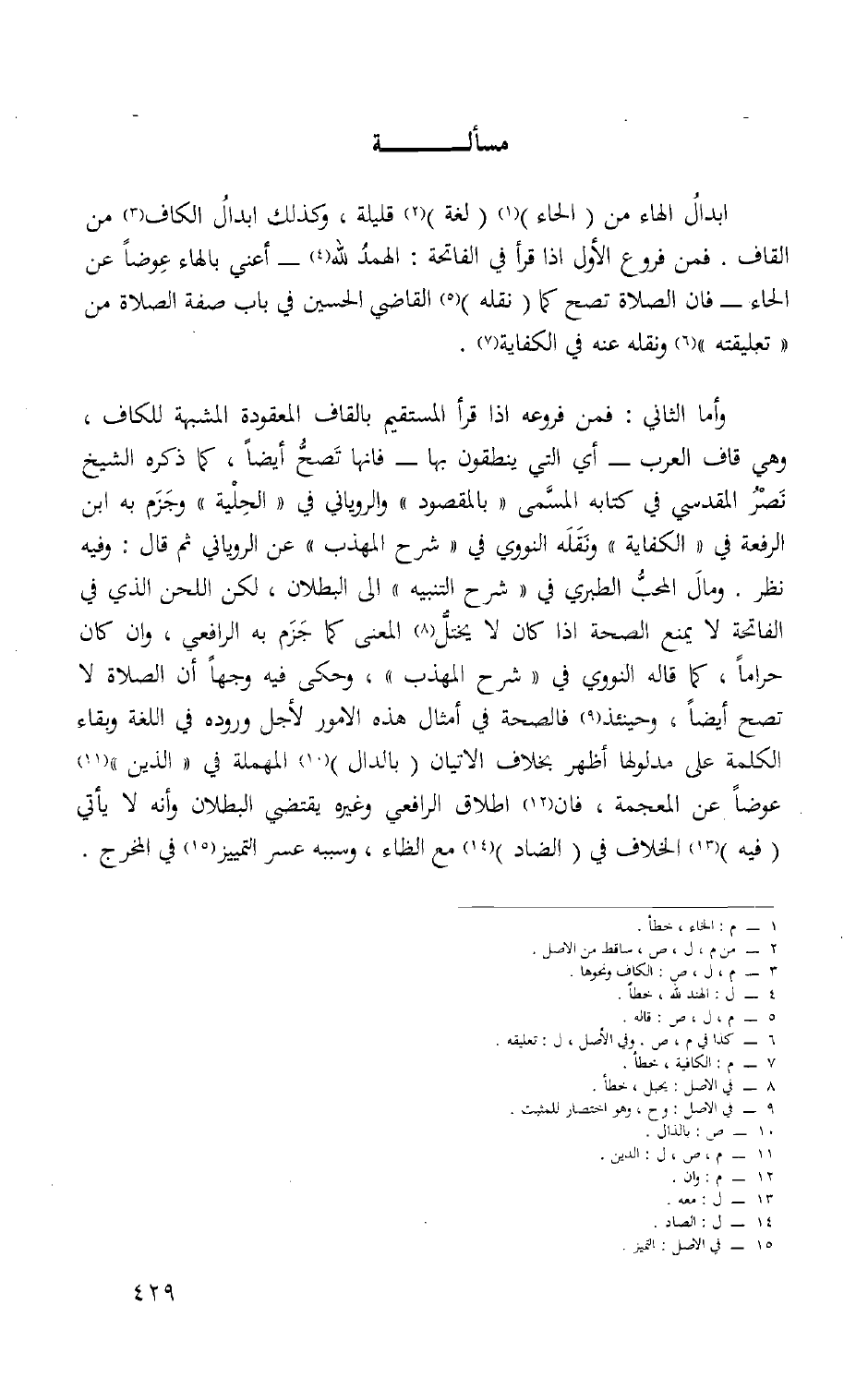 إِبْدَال الْهَاء من الْحَاء لُغَة قَليلَة وَكَذَلِكَ إِبْدَال الْكَاف من الْقَاف فَمن فروع الأول إِذا قَرَأَ فِي الْفَاتِحَة الهمد لله أَعنِي بِالْهَاءِ عوضا عَن الْحَاء فَإِن الصَّلَاة تصح كَمَا نَقله القَاضِي الْحُسَيْن فِي بَاب صفة الصَّلَاة من تعليقته وَنَقله عَنهُ فِي الْكِفَايَة