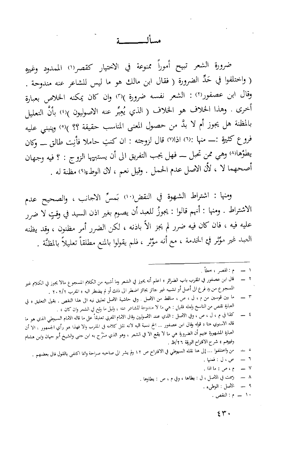 ضَرُورَة الشّعْر تبيح أمورا مَمْنُوعَة فِي الِاخْتِيَار كقصر الْمَمْدُود وَغَيره وَاخْتلفُوا فِي حد الضَّرُورَة فَقَالَ ابْن مَالك هُوَ مَا لَيْسَ للشاعر عَنهُ مندوحة وَقَالَ ابْن عُصْفُور الشّعْر نَفسه ضَرُورَة وَإِن كَانَ يُمكنهُ الْخَلَاص بِعِبَارَة أُخْرَى وَهَذَا الْخلاف هُوَ الْخلاف الَّذِي يعبر عَنهُ الأصوليون بِأَن التَّعْلِيل بالمظنة هَل يجوز أم لَا بُد من حُصُول الْمَعْنى الْمُنَاسب حَقِيقَة وَيَنْبَنِي عَلَيْهِ فروع كَثِيرَة مِنْهَا إِذا قَالَ لزوجته إِن كنت حَامِلا فَأَنت طَالِق وَكَانَ يَطَؤُهَا وَهِي مِمَّن تحبل فَهَل يجب التَّفْرِيق إِلَى أَن يستبريها الزَّوْج فِيهِ وَجْهَان أصَحهمَا لَا لِأَن الأَصْل عدم الْحمل وَقيل نعم لِأَن الْوَطْء مَظَنَّة لَهُ
