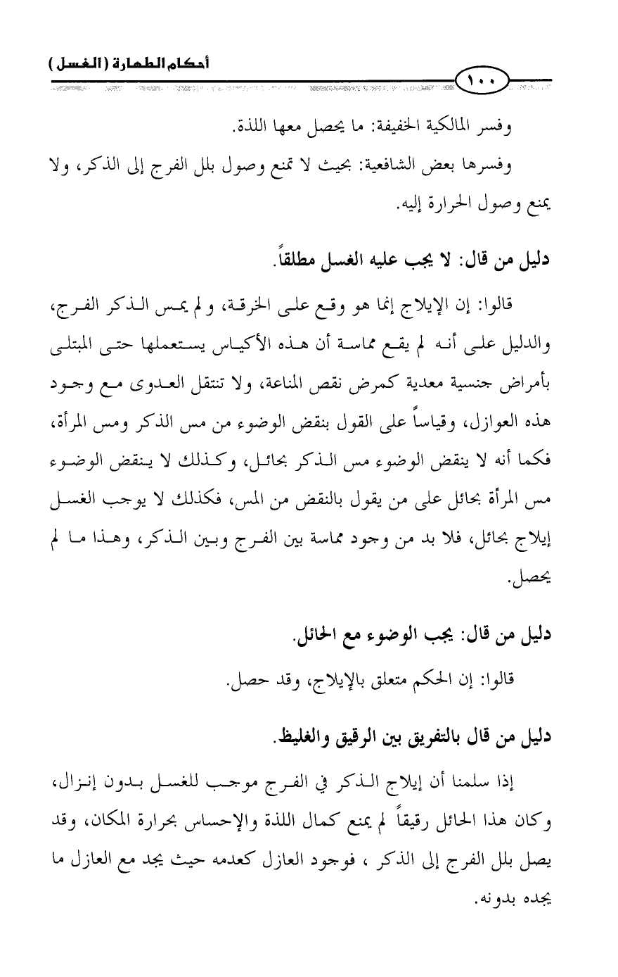 إذا سلمنا أن إيلاج الذكر في الفرج موجب للغسل بدون إنزال، وكان هذا الحائل رقيقاً لم يمنع كمال اللذة والإحساس بحرارة المكان، وقد يصل بلل الفرج إلى الذكر، فوجود العازل كعدمه حيث يجد مع العازل ما يجده بدونه.