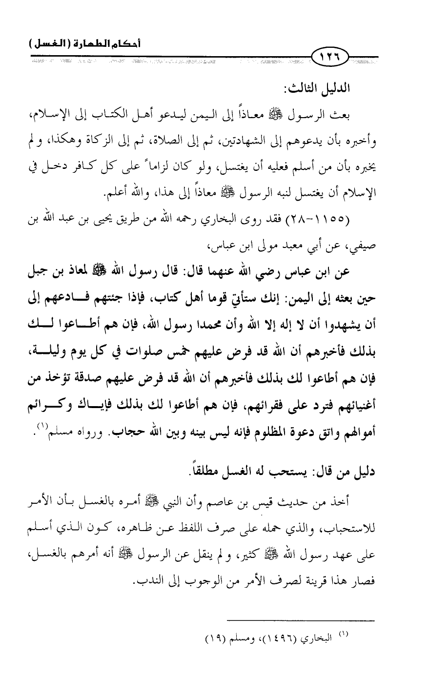 بعث الرسول - صلى الله عليه وسلم - معاذاً إلى اليمن ليدعو أهل الكتاب إلى الإسلام، وأخبره بأن يدعوهم إلى الشهادتين، ثم إلى الصلاة، ثم إلى الزكاة وهكذا، ولم يخبره بأن من أسلم فعليه أن يغتسل، ولو كان لزاماً على كل كافر دخل في الإسلام أن يغتسل لنبه الرسول - صلى الله عليه وسلم - معاذاً إلى هذا، والله أعلم.