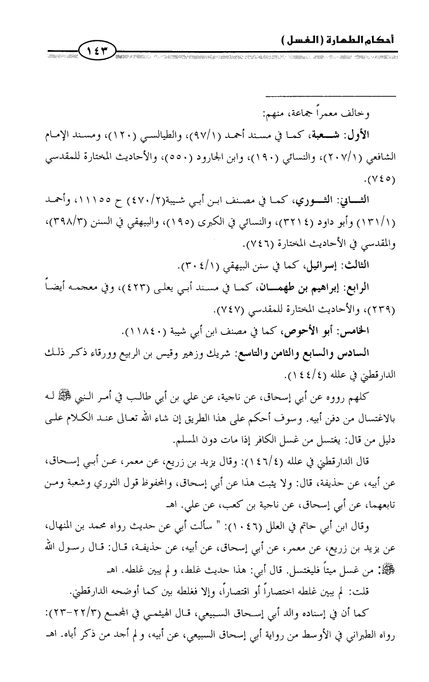 كلهم رووه عن أبي إسحاق، عن ناجية، عن علي بن أبي طالب في أمر النبي - صلى الله عليه وسلم - له بالاغتسال من دفن أبيه. وسوف أحكم على هذا الطريق إن شاء الله تعالى عند الكلام على دليل من قال: يغتسل من غسل الكافر إذا مات دون المسلم.