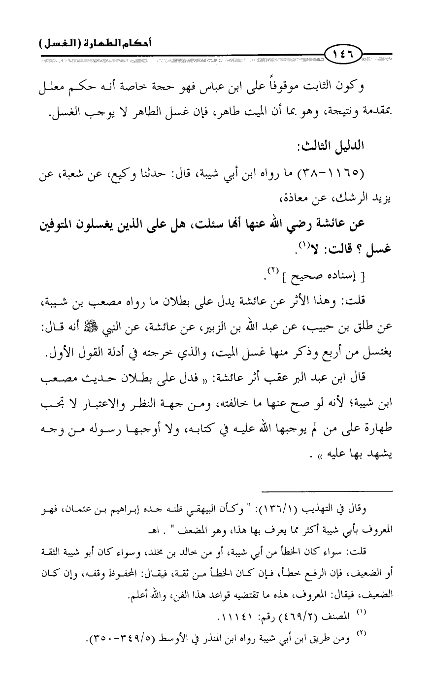 قلت: وهذا الأثر عن عائشة يدل على بطلان ما رواه مصعب بن شيبة، عن طلق بن حبيب، عن عبد الله بن الزبير، عن عائشة، عن النبي - صلى الله عليه وسلم - أنه قال: يغتسل من أربع وذكر منها غسل الميت، والذي خرجته في أدلة القول الأول.