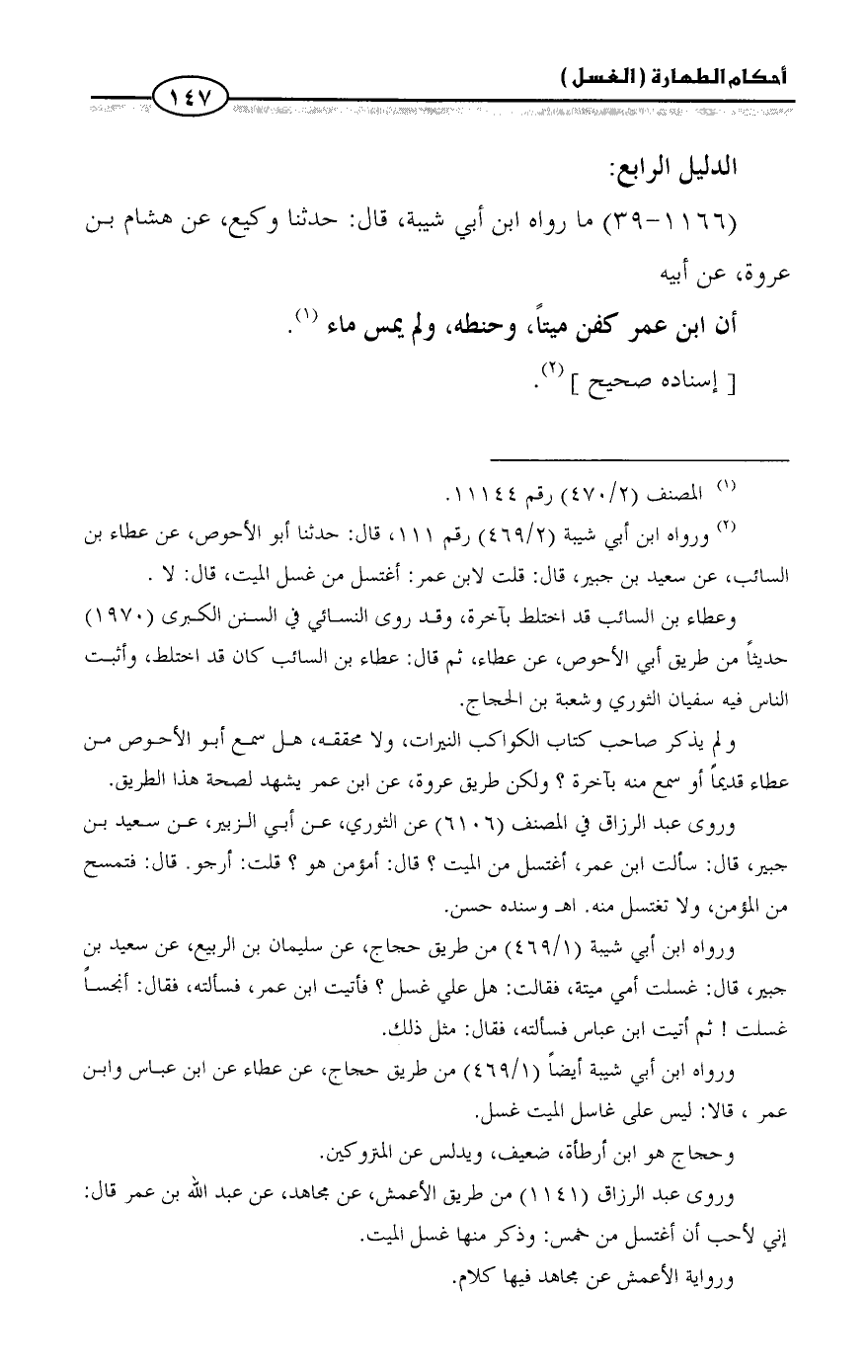 (¬٢) ورواه ابن أبي شيبة (٢/ ٤٦٩) رقم ١١١، قال: حدثنا أبو الأحوص، عن عطاء بن السائب، عن سعيد بن جبير، قال: قلت لابن عمر: أغتسل من غسل الميت، قال: لا.