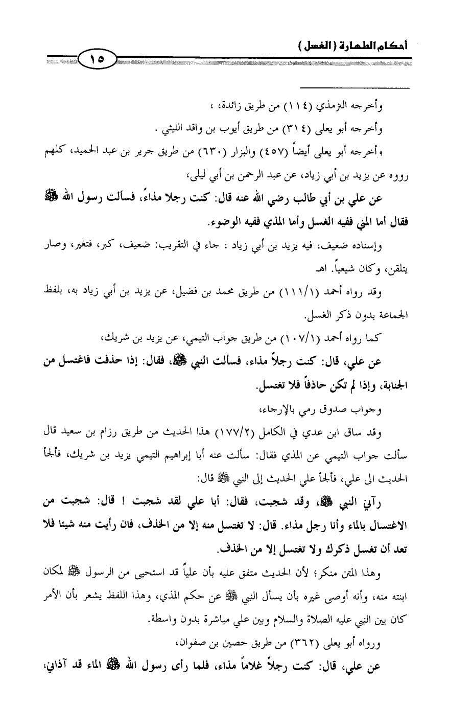 عن علي، قال: كنت رجلاً غلاماً مذاء، فلما رأى رسول الله - صلى الله عليه وسلم - الماء قد آذاني، =