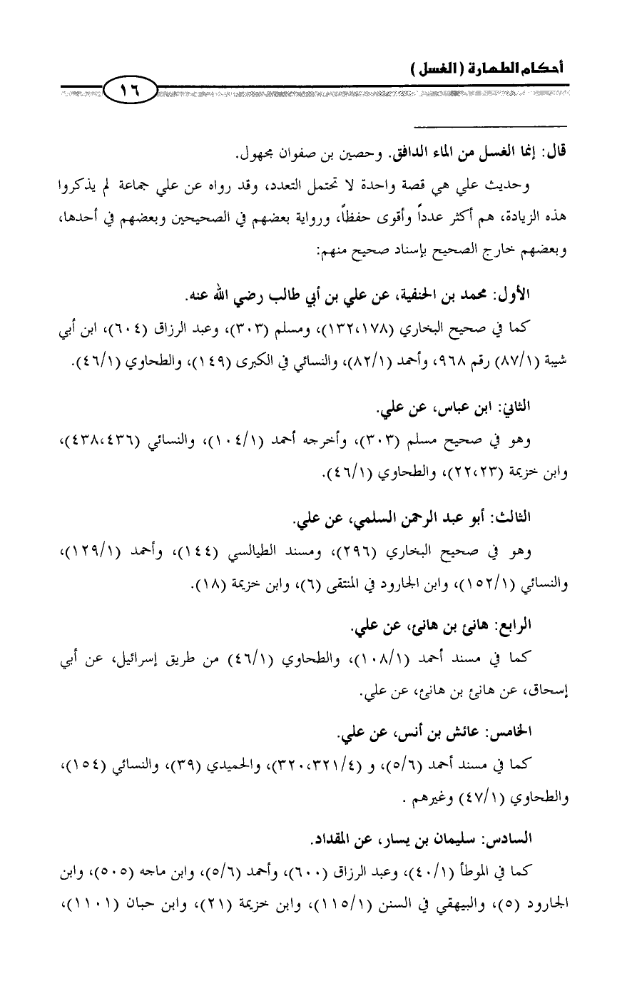 كما في صحيح البخاري (١٣٢،١٧٨)، ومسلم (٣٠٣)، وعبد الرزاق (٦٠٤)، ابن أبي شيبة (١/ ٨٧) رقم ٩٦٨، وأحمد (١/ ٨٢)، والنسائي في الكبرى (١٤٩)، والطحاوي (١/ ٤٦).