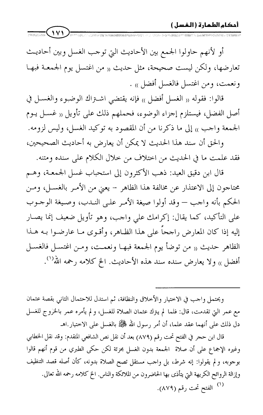 قال ابن دقيق العيد: ذهب الأكثرون إلى استحباب غسل الجمعة، وهم محتاجون إلى الاعتذار عن مخالفة هذا الظاهر - يعني من الأمر بالغسل، ومن الحكم بأنه واجب - وقد أولوا صيغة الأمر على الندب، وصيغة الوجوب على التأكيد، كما يقال: إكرامك علي واجب، وهو تأويل ضعيف إنما يصار إليه إذا كان المعارض راجحاً على هذا الظاهر، وأقوى ما عارضوا به هذا الظاهر حديث «من توضأ يوم الجمعة فبها ونعمت، ومن اغتسل فالغسل أفضل» ولا يعارض سنده سند هذه الأحاديث. الخ كلامه رحمه الله (¬١).