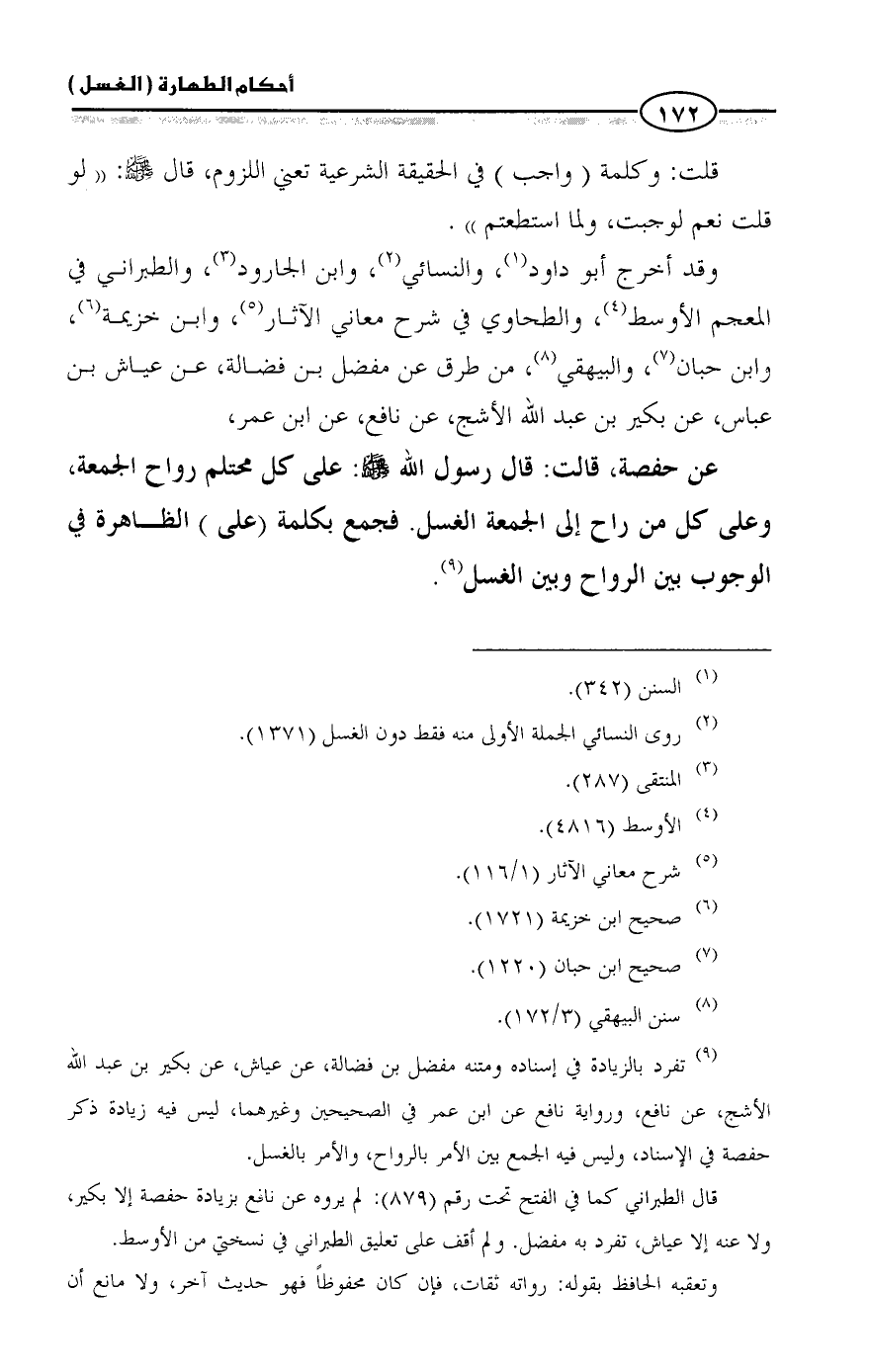 عن حفصة، قالت: قال رسول الله - صلى الله عليه وسلم -: على كل محتلم رواح الجمعة، وعلى كل من راح إلى الجمعة الغسل. فجمع بكلمة (على) الظاهرة في الوجوب بين الرواح وبين الغسل (¬٩).
