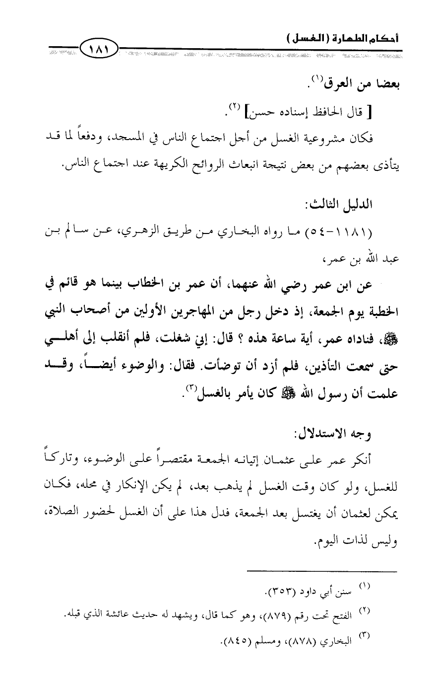 عن ابن عمر رضي الله عنهما، أن عمر بن الخطاب بينما هو قائم في الخطبة يوم الجمعة، إذ دخل رجل من المهاجرين الأولين من أصحاب النبي - صلى الله عليه وسلم -، فناداه عمر، أية ساعة هذه؟ قال: إني شغلت، فلم أنقلب إلى أهلي حتى سمعت التأذين، فلم أزد أن توضأت. فقال: والوضوء أيضاً، وقد علمت أن رسول الله - صلى الله عليه وسلم - كان يأمر بالغسل (¬٣).