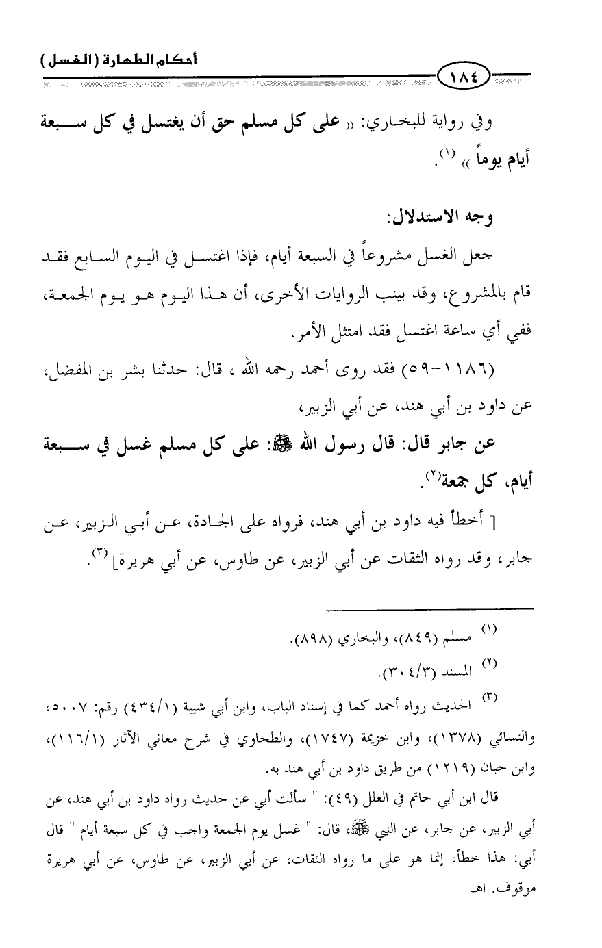عن جابر قال: قال رسول الله - صلى الله عليه وسلم -: على كل مسلم غسل في سبعة أيام، كل جمعة (¬٢).