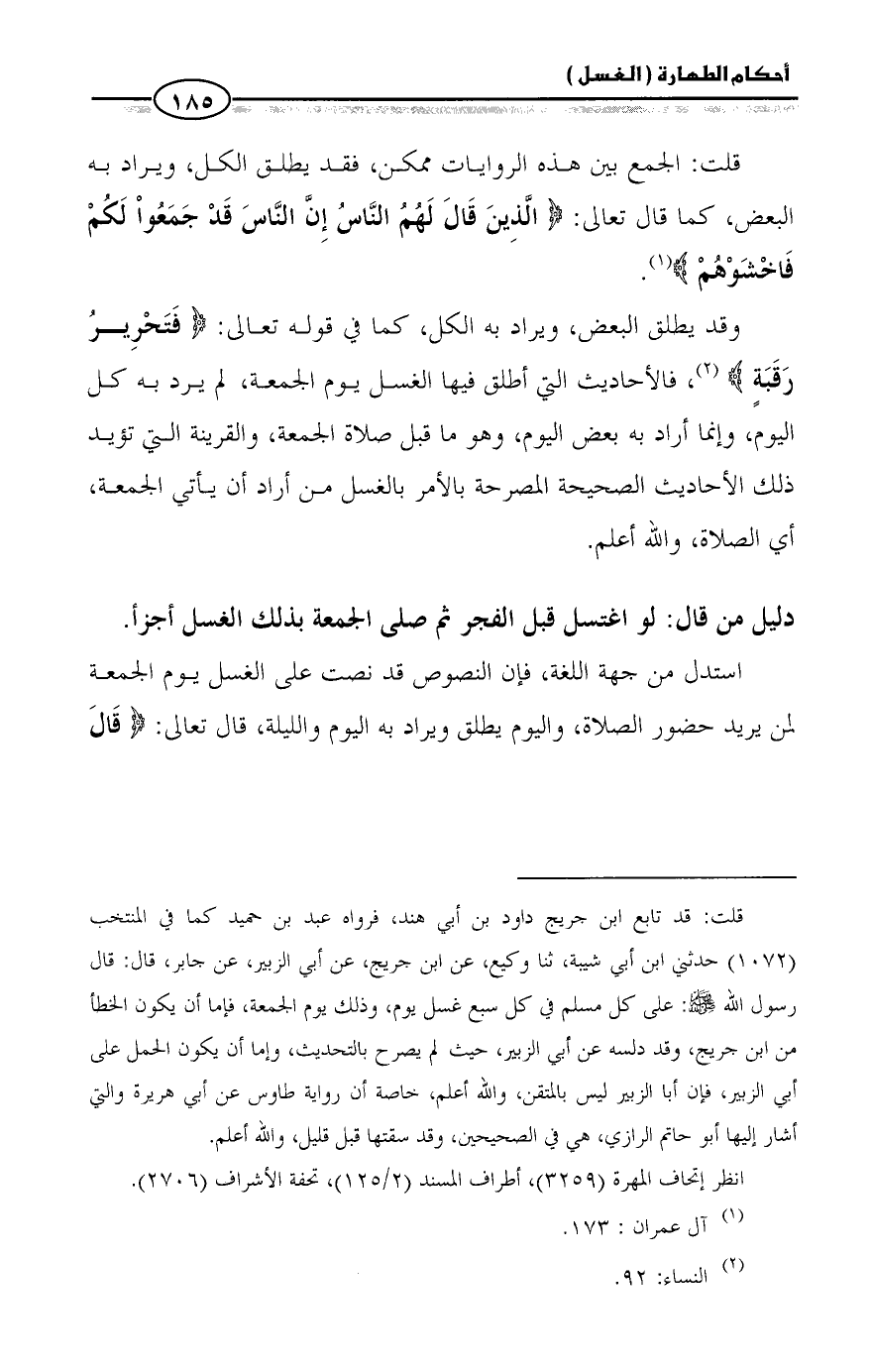 رقبة} (¬٢)، فالأحاديث التي أطلق فيها الغسل يوم الجمعة، لم يرد به كل اليوم، وإنما أراد به بعض اليوم، وهو ما قبل صلاة الجمعة، والقرينة التي تؤيد ذلك الأحاديث الصحيحة المصرحة بالأمر بالغسل من أراد أن يأتي الجمعة، أي الصلاة، والله أعلم.