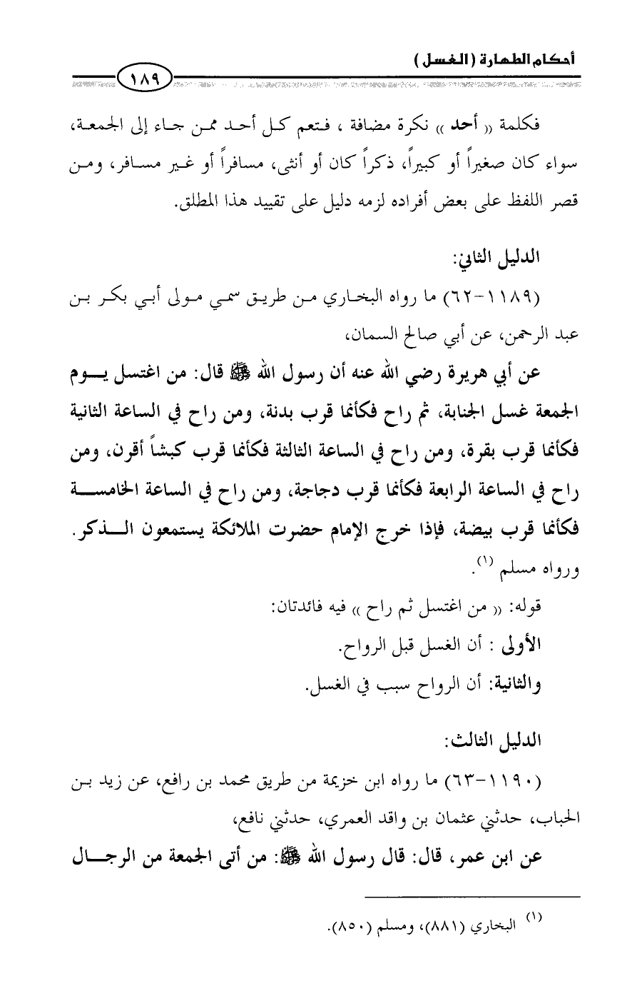 عن أبي هريرة رضي الله عنه أن رسول الله - صلى الله عليه وسلم - قال: من اغتسل يوم الجمعة غسل الجنابة، ثم راح فكأنما قرب بدنة، ومن راح في الساعة الثانية فكأنما قرب بقرة، ومن راح في الساعة الثالثة فكأنما قرب كبشاً أقرن، ومن راح في الساعة الرابعة فكأنما قرب دجاجة، ومن راح في الساعة الخامسة فكأنما قرب بيضة، فإذا خرج الإمام حضرت الملائكة يستمعون الذكر. ووراه مسلم (¬١).