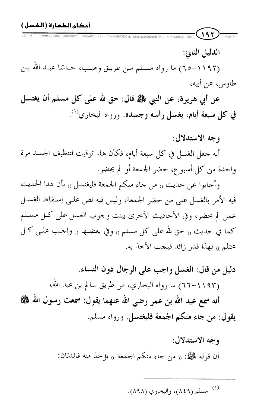 وأجابوا عن حديث «من جاء منكم الجمعة فليغتسل» بأن هذا الحديث فيه الأمر بالغسل على من حضر الجمعة، وليس فيه نص على إسقاط الغسل عمن لم يحضر، وفي الأحاديث الأخرى بينت وجوب الغسل على كل مسلم كما في حديث «حق لله على كل مسلم» وفي بعضها «واجب على كل محتلم» فهذا قدر زائد فيجب الأخذ به.
