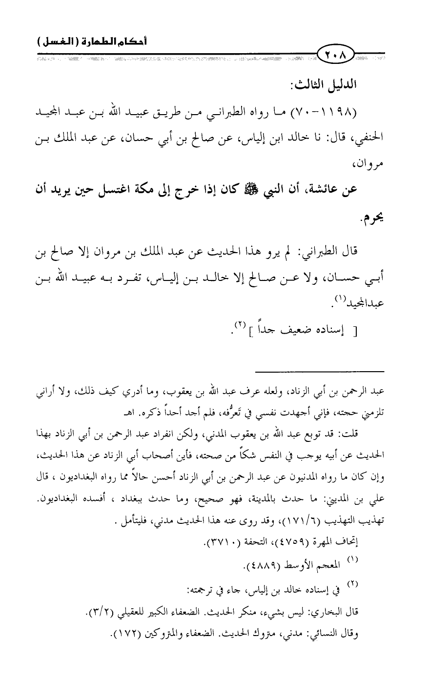 (١١٩٨ - ٧٠) ما رواه الطبراني من طريق عبيد الله بن عبد المجيد الحنفي، قال: نا خالد ابن إلياس، عن صالح بن أبي حسان، عن عبد الملك بن مروان،