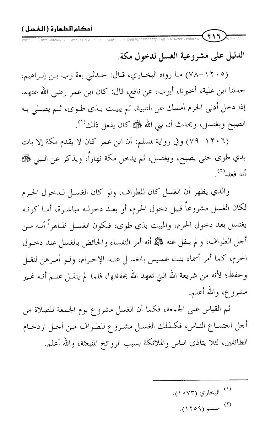 (١٢٠٦ - ٧٩) وفي رواية لمسلم: أن ابن عمر كان لا يقدم مكة إلا بات بذي طوى حتى يصبح، ويغتسل، ثم يدخل مكة نهاراً، ويذكر عن النبي - صلى الله عليه وسلم - أنه فعله (¬٢).