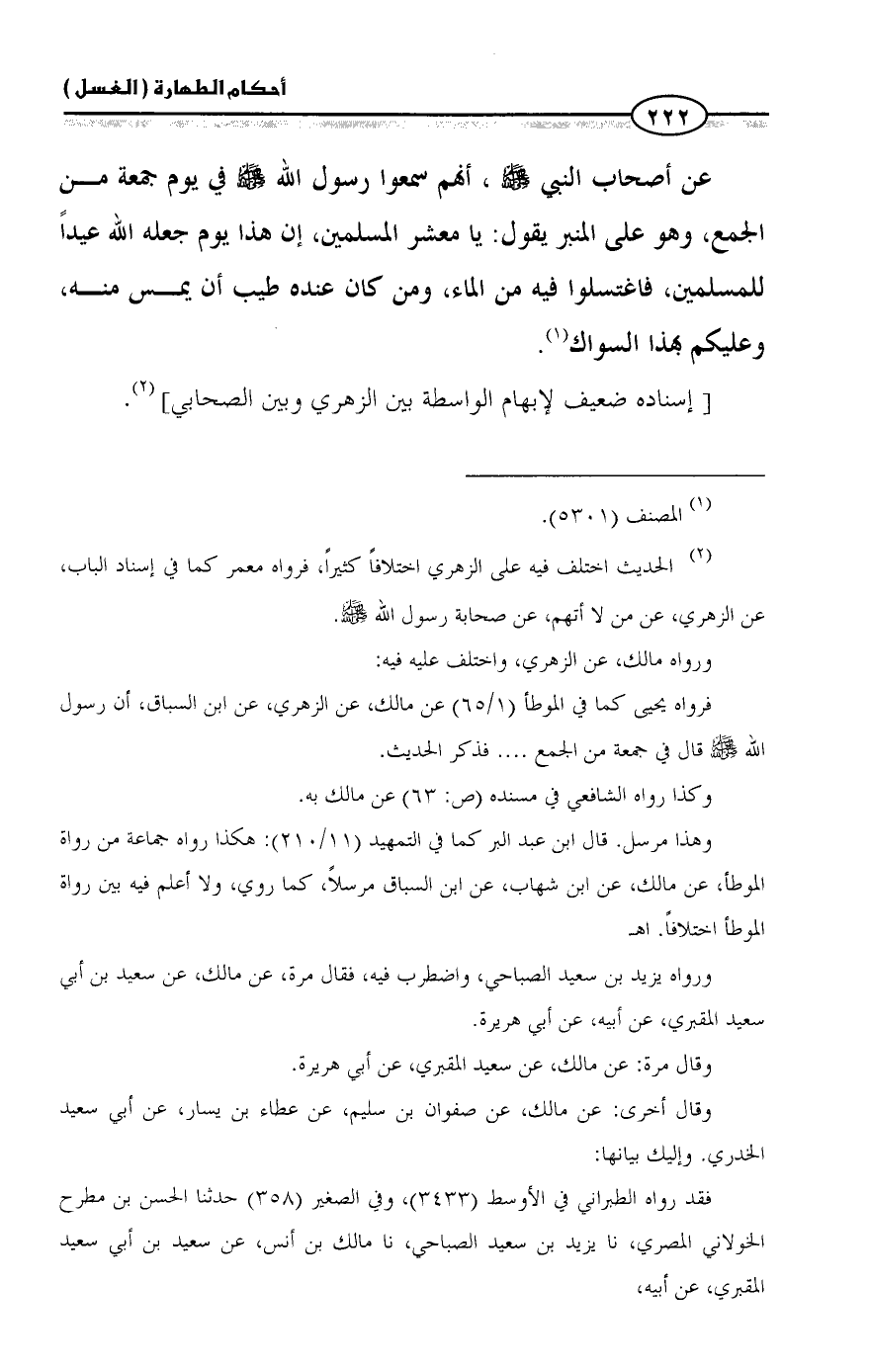 عن أصحاب النبي - صلى الله عليه وسلم -، أنهم سمعوا رسول الله - صلى الله عليه وسلم - في يوم جمعة من الجمع، وهو على المنبر يقول: يا معشر المسلمين، إن هذا يوم جعله الله عيداً للمسلمين، فاغتسلوا فيه من الماء، ومن كان عنده طيب أن يمس منه، وعليكم بهذا السواك (¬١).