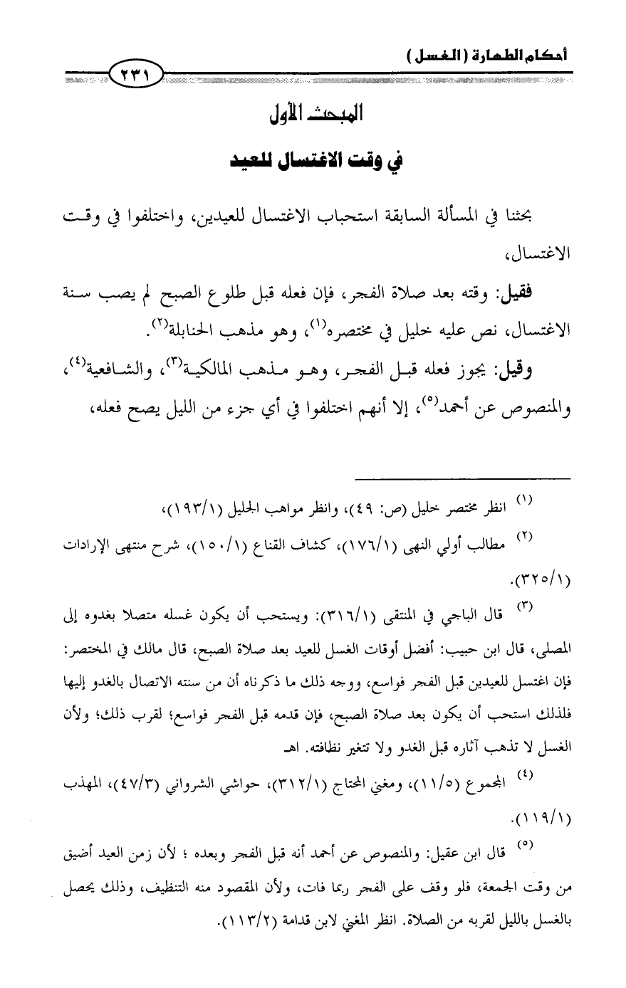 (¬٥) قال ابن عقيل: والمنصوص عن أحمد أنه قبل الفجر وبعده؛ لأن زمن العيد أضيق من وقت الجمعة، فلو وقف على الفجر ربما فات، ولأن المقصود منه التنظيف، وذلك يحصل بالغسل بالليل لقربه من الصلاة. انظر المغني لابن قدامة (٢/ ١١٣).