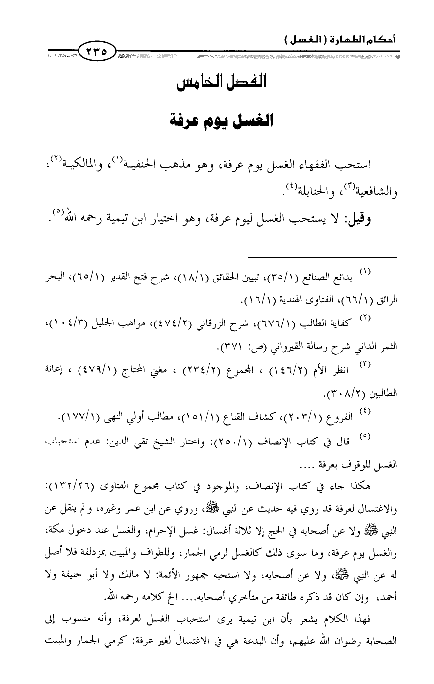 (¬٥) قال في كتاب الإنصاف (١/ ٢٥٠): واختار الشيخ تقي الدين: عدم استحباب الغسل للوقوف بعرفة ....