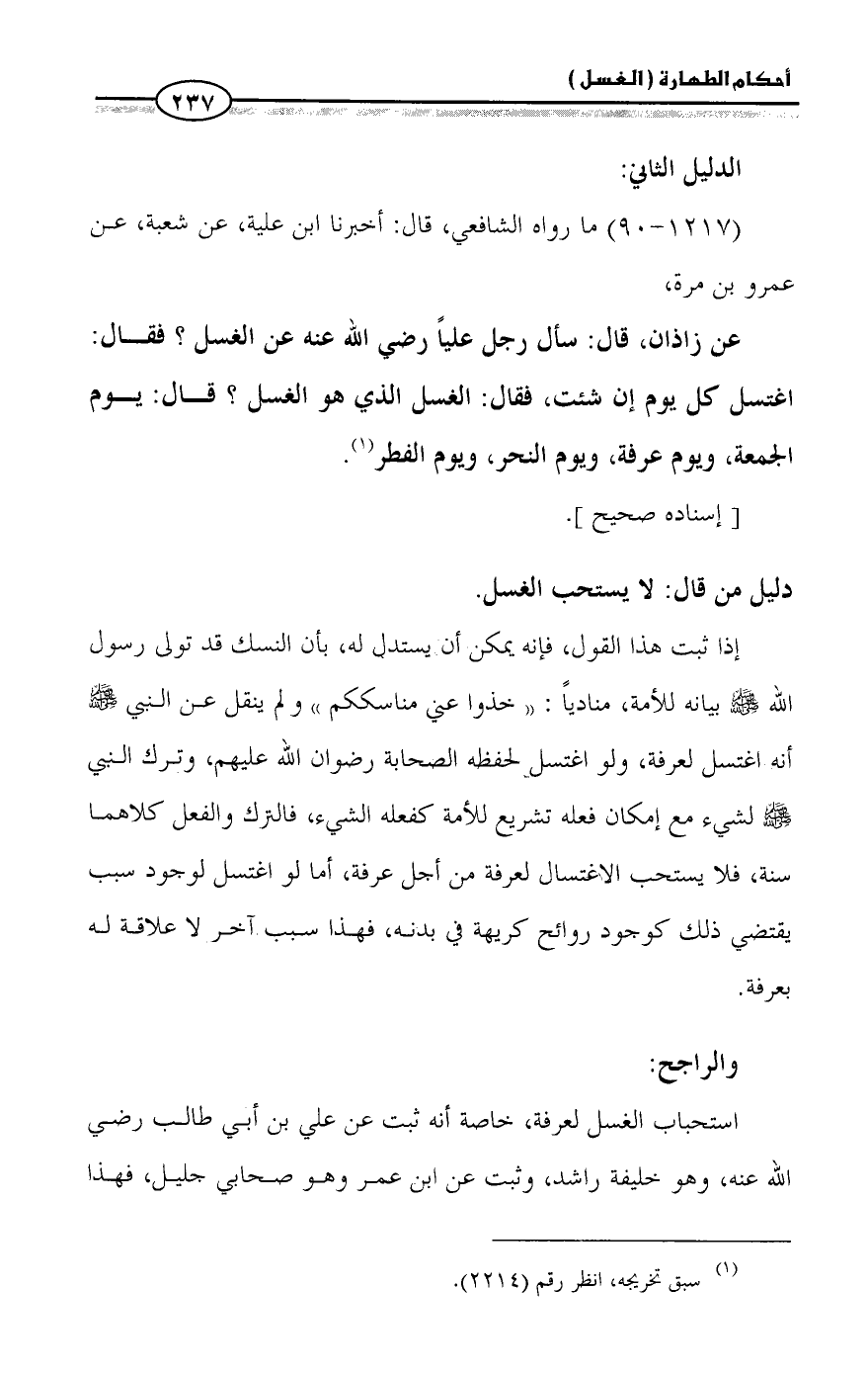 استحباب الغسل لعرفة، خاصة أنه ثبت عن علي بن أبي طالب رضي الله عنه، وهو خليفة راشد، وثبت عن ابن عمر وهو صحابي جليل، فهذا
