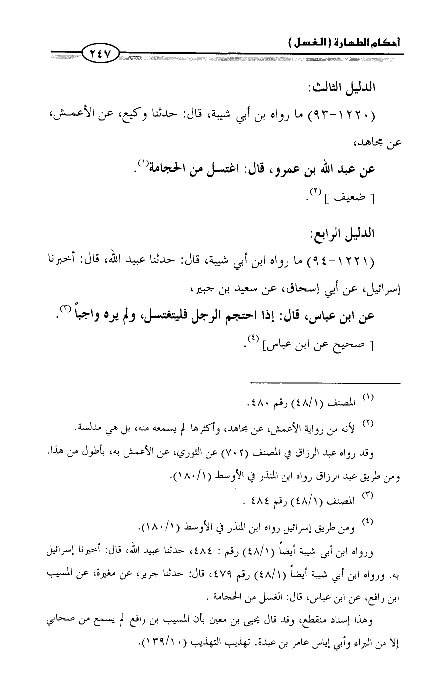 ورواه ابن أبي شيبة أيضاً (١/ ٤٨) رقم: ٤٨٤، حدثنا عبيد الله، قال: أخبرنا إسرائيل به. ورواه ابن أبي شيبة أيضاً (١/ ٤٨) رقم ٤٧٩، قال: حدثنا جرير، عن مغيرة، عن المسيب ابن رافع، عن ابن عباس، قال: الغسل من الحجامة.