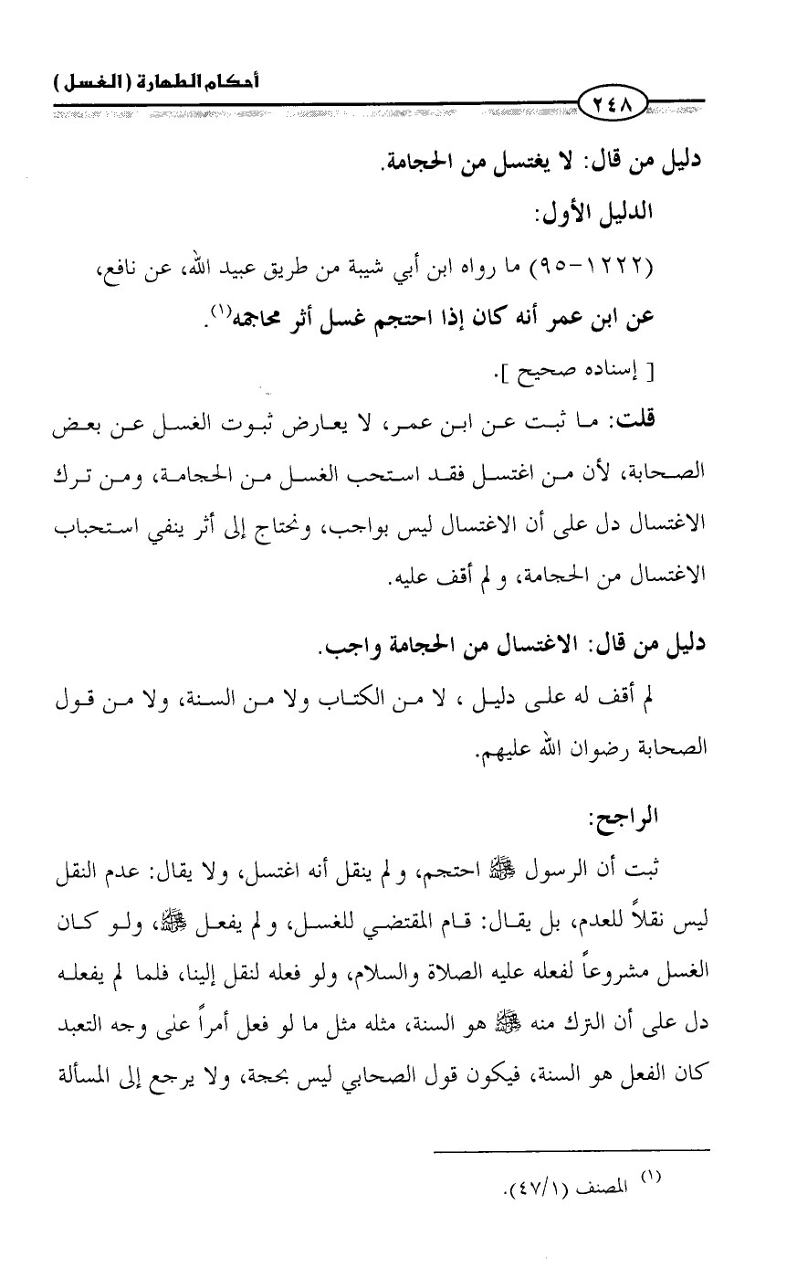قلت: ما ثبت عن ابن عمر، لا يعارض ثبوت الغسل عن بعض الصحابة، لأن من اغتسل فقد استحب الغسل من الحجامة، ومن ترك الاغتسال دل على أن الاغتسال ليس بواجب، ونحتاج إلى أثر ينفي استحباب الاغتسال من الحجامة، ولم أقف عليه.