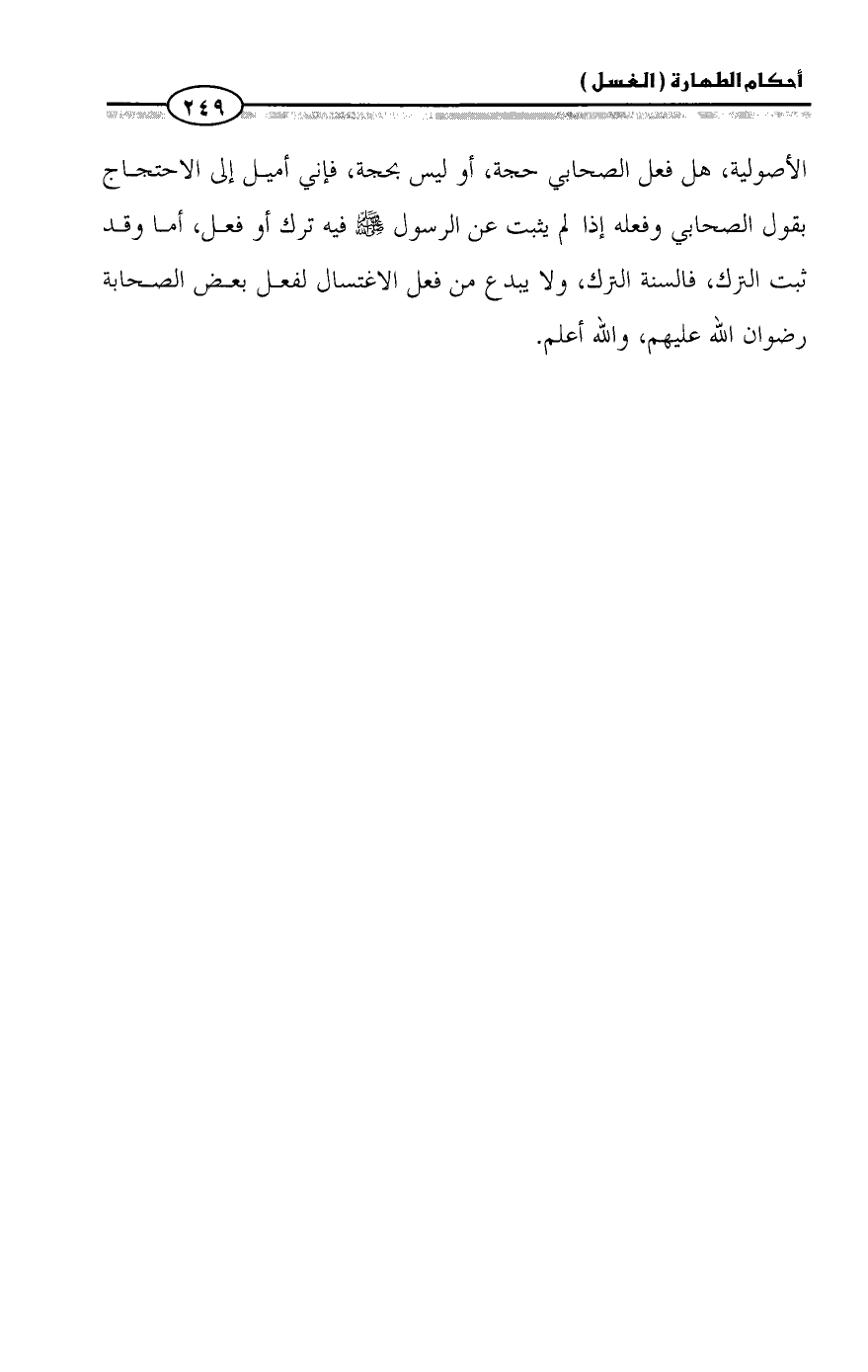 الأصولية، هل فعل الصحابي حجة، أو ليس بحجة، فإني أميل إلى الاحتجاج بقول الصحابي وفعله إذا لم يثبت عن الرسول - صلى الله عليه وسلم - فيه ترك أو فعل، أما وقد ثبت الترك، فالسنة الترك، ولا يبدع من فعل الاغتسال لفعل بعض الصحابة رضوان الله عليهم، والله أعلم.