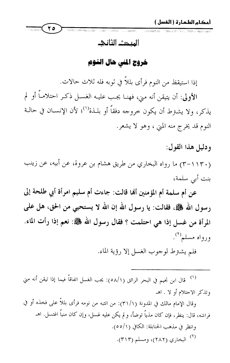 عن أم سلمة أم المؤمنين أنها قالت: جاءت أم سليم امرأة أبي طلحة إلى رسول الله - صلى الله عليه وسلم -، فقالت: يا رسول الله إن الله لا يستحيي من الحق، هل على المرأة من غسل إذا هي احتلمت؟ فقال رسول الله - صلى الله عليه وسلم -: نعم إذا رأت الماء. ورواه مسلم (¬٢).