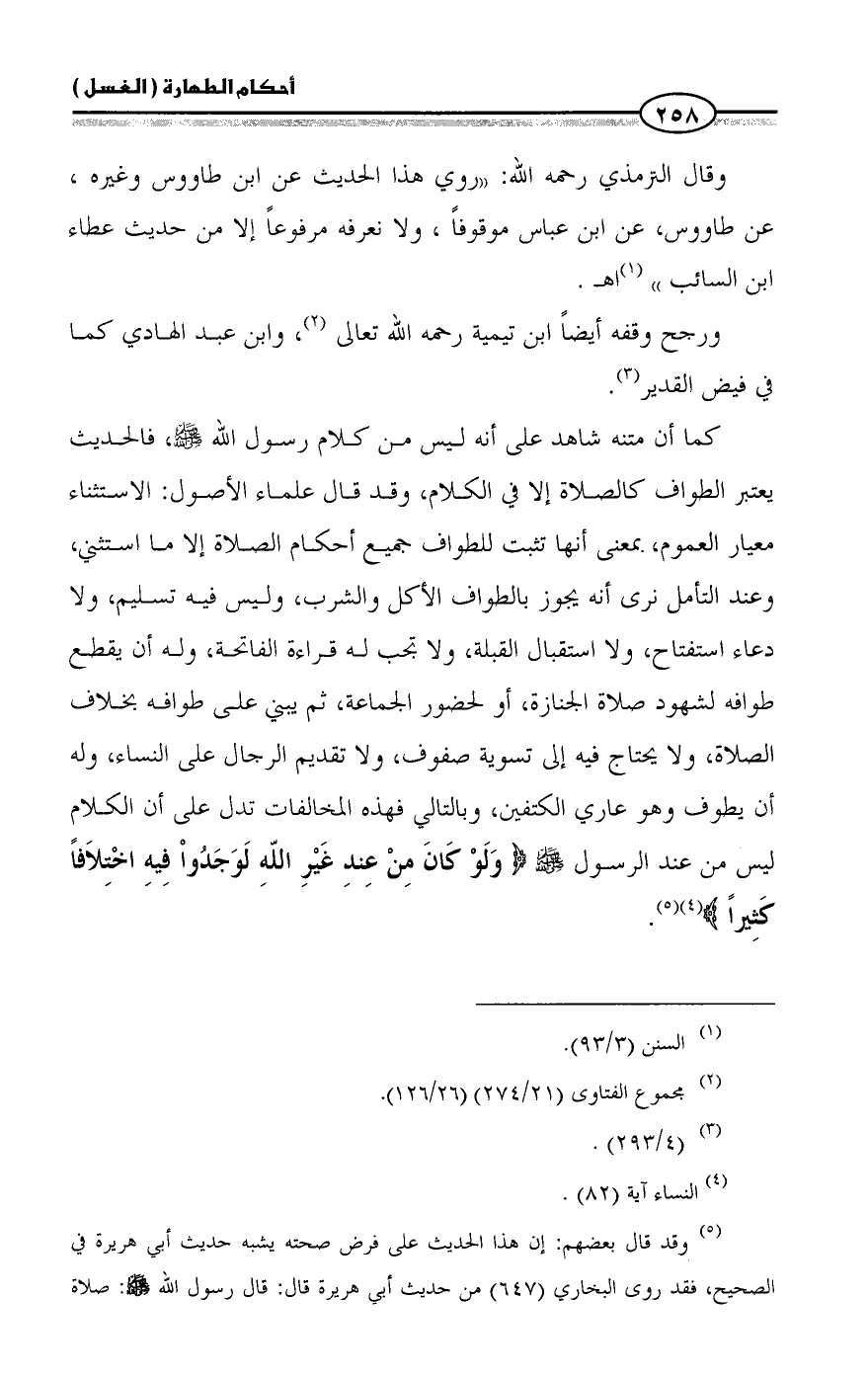 كما أن متنه شاهد على أنه ليس من كلام رسول الله - صلى الله عليه وسلم -، فالحديث يعتبر الطواف كالصلاة إلا في الكلام، وقد قال علماء الأصول: الاستثناء معيار العموم، بمعنى أنها تثبت للطواف جميع أحكام الصلاة إلا ما استثني، وعند التأمل نرى أنه يجوز بالطواف الأكل والشرب، وليس فيه تسليم، ولا دعاء استفتاح، ولا استقبال القبلة، ولا تجب له قراءة الفاتحة، وله أن يقطع طوافه لشهود صلاة الجنازة، أو لحضور الجماعة، ثم يبني على طوافه بخلاف الصلاة، ولا يحتاج فيه إلى تسوية صفوف، ولا تقديم الرجال على النساء، وله أن يطوف وهو عاري الكتفين، وبالتالي فهذه المخالفات تدل على أن الكلام ليس من عند الرسول - صلى الله عليه وسلم - {ولو كان من عند غير الله لوجدوا فيه اختلافاً كثيراً} (¬٤) (¬٥).