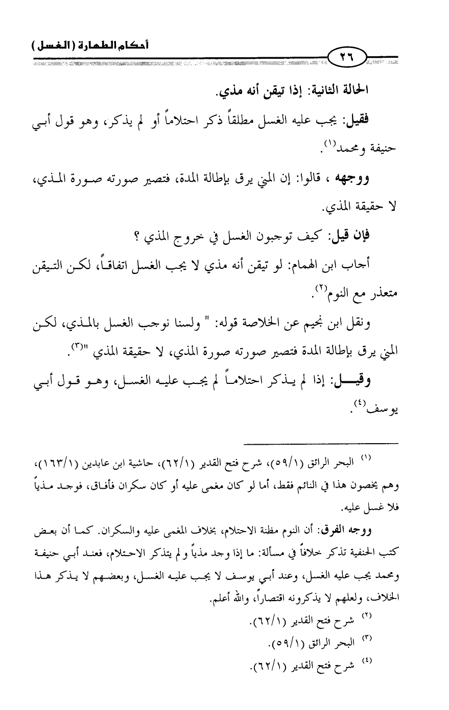 (¬١) البحر الرائق (١/ ٥٩)، شرح فتح القدير (١/ ٦٢)، حاشية ابن عابدين (١/ ١٦٣)، وهم يخصون هذا في النائم فقط، أما لو كان مغمى عليه أو كان سكران فأفاق، فوجد مذياً فلا غسل عليه.