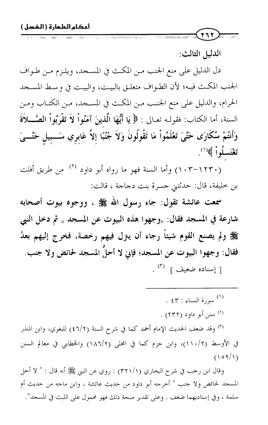 وقال ابن رجب في شرح البخاري (١/ ٣٢١): روي عن النبي - صلى الله عليه وسلم - أنه قال: " لا أحل المسجد لحائض ولا جنب " أخرجه أبو داود من حديث عائشة، وابن ماجه من حديث أم سلمة، وفي إسناديهما ضعف. وعلى تقدير صحة ذلك فهو محمول على اللبث في المسجد". =