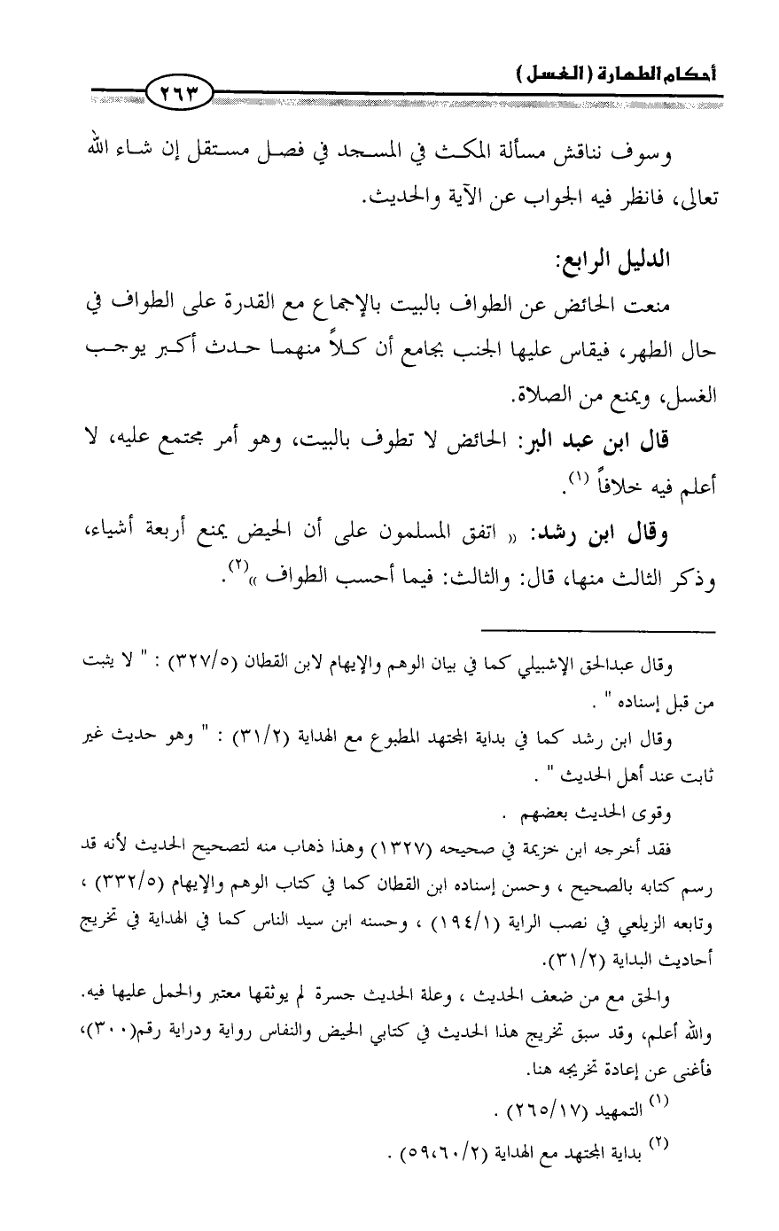 وقال ابن رشد: «اتفق المسلمون على أن الحيض يمنع أربعة أشياء، وذكر الثالث منها، قال: والثالث: فيما أحسب الطواف» (¬٢).