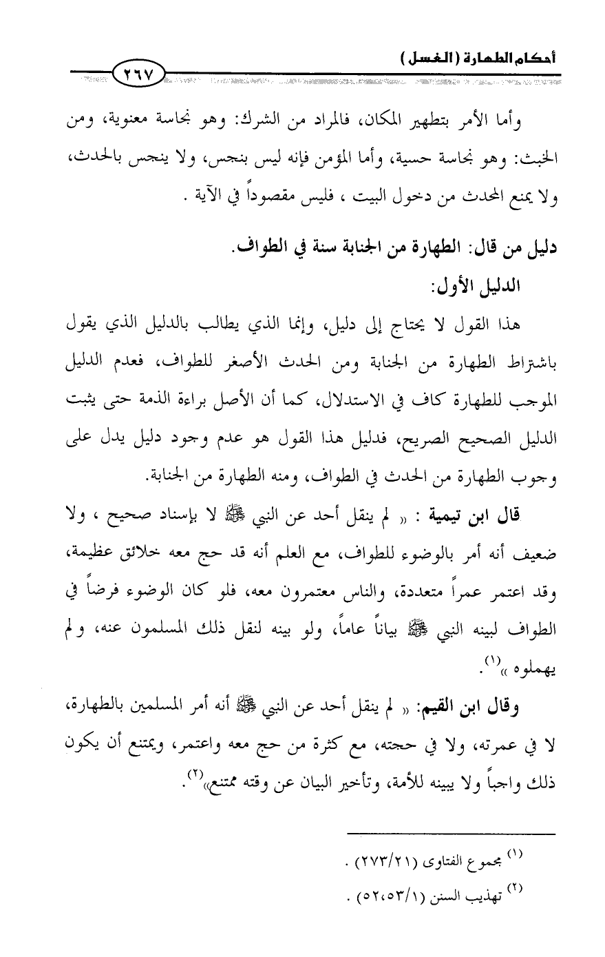 دليل من قال: الطهارة من الجنابة سنة في الطواف.