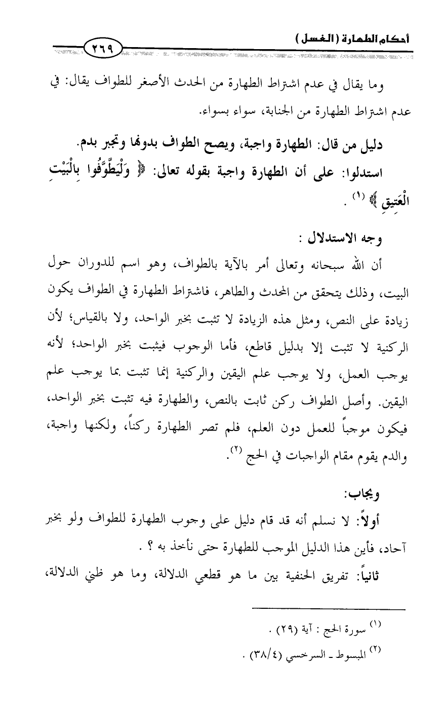أن الله سبحانه وتعالى أمر بالآية بالطواف، وهو اسم للدوران حول البيت، وذلك يتحقق من المحدث والطاهر، فاشتراط الطهارة في الطواف يكون زيادة على النص، ومثل هذه الزيادة لا تثبت بخبر الواحد، ولا بالقياس؛ لأن الركنية لا تثبت إلا بدليل قاطع، فأما الوجوب فيثبت بخبر الواحد؛ لأنه يوجب العمل، ولا يوجب علم اليقين والركنية إنما تثبت بما يوجب علم اليقين. وأصل الطواف ركن ثابت بالنص، والطهارة فيه تثبت بخبر الواحد، فيكون موجباً للعمل دون العلم، فلم تصر الطهارة ركناً، ولكنها واجبة، والدم يقوم مقام الواجبات في الحج (¬٢).