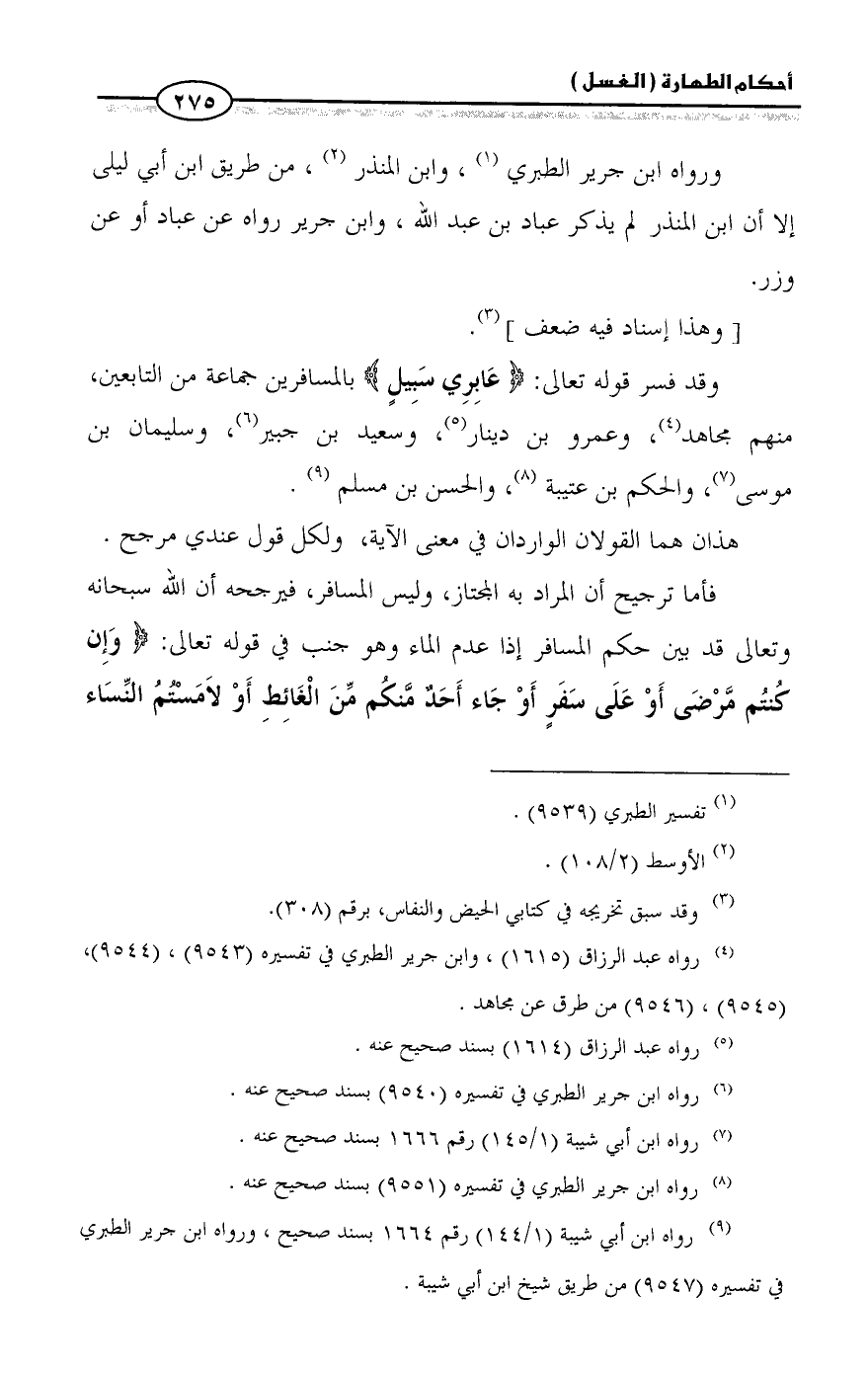 وقد فسر قوله تعالى: {عابري سبيل} بالمسافرين جماعة من التابعين، منهم مجاهد (¬٤)، وعمرو بن دينار (¬٥)، وسعيد بن جبير (¬٦)، وسليمان بن موسى (¬٧)، والحكم بن عتيبة (¬٨)، والحسن بن مسلم (¬٩).