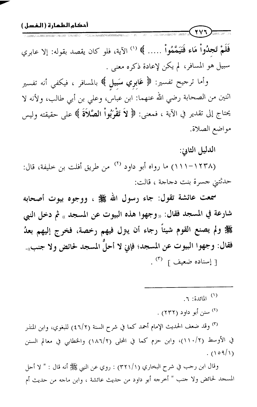 وقال ابن رجب في شرح البخاري (١/ ٣٢١): روي عن النبي - صلى الله عليه وسلم - أنه قال: " لا أحل المسجد لحائض ولا جنب " أخرجه أبو داود من حديث عائشة، وابن ماجه من حديث أم =