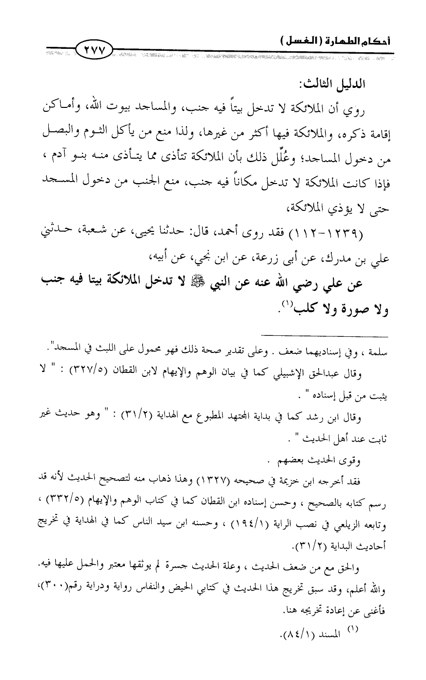 عن علي رضي الله عنه عن النبي - صلى الله عليه وسلم - لا تدخل الملائكة بيتا فيه جنب ولا صورة ولا كلب (¬١).