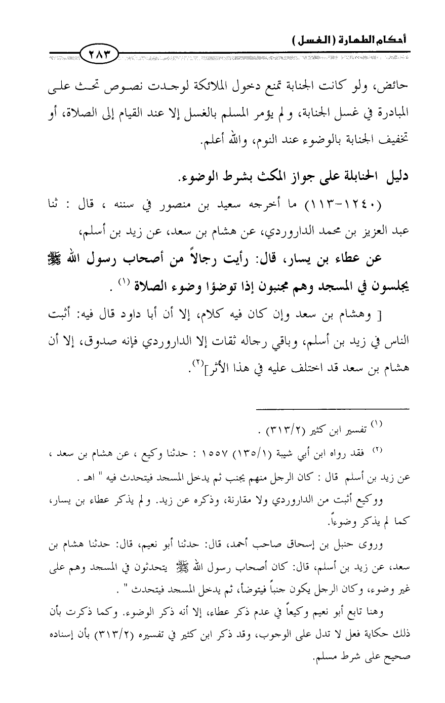 (¬٢) فقد رواه ابن أبي شيبة (١/ ١٣٥) ١٥٥٧: حدثنا وكيع، عن هشام بن سعد، عن زيد بن أسلم قال: كان الرجل منهم يجنب ثم يدخل المسجد فيتحدث فيه " اهـ.