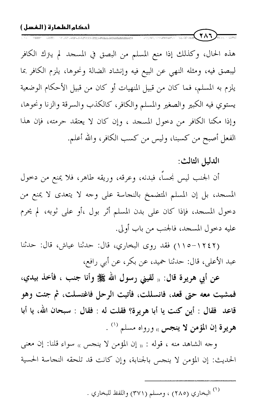 عن أبي هريرة قال: «لقيني رسول الله - صلى الله عليه وسلم - وأنا جنب، فأخذ بيدي، فمشيت معه حتى قعد، فانسللت، فأتيت الرحل فاغتسلت، ثم جئت وهو قاعد فقال: أين كنت يا أبا هريرة؟ فقلت له: فقال: سبحان الله، يا أبا هريرة إن المؤمن لا ينجس» ورواه مسلم (¬١).