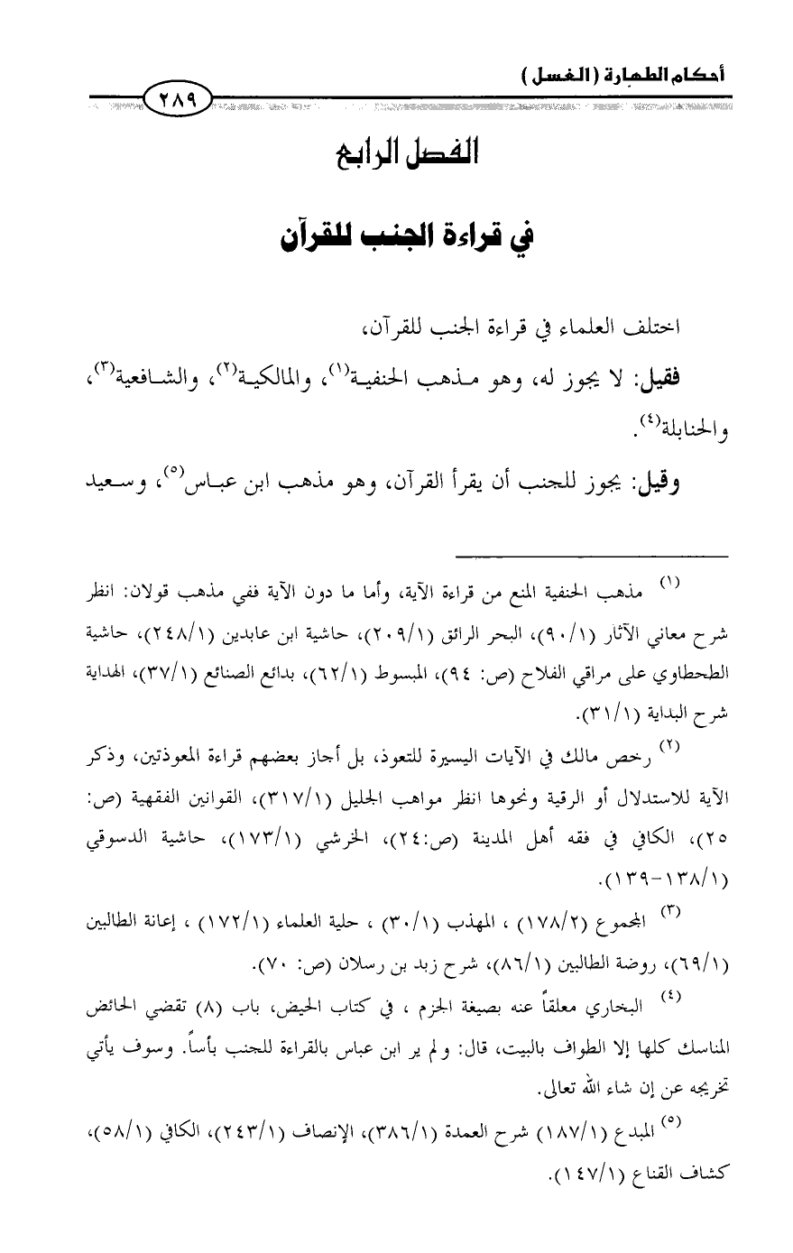 (¬١) مذهب الحنفية المنع من قراءة الآية، وأما ما دون الآية ففي مذهب قولان: انظر شرح معاني الآثار (١/ ٩٠)، البحر الرائق (١/ ٢٠٩)، حاشية ابن عابدين (١/ ٢٤٨)، حاشية الطحطاوي على مراقي الفلاح (ص: ٩٤)، المبسوط (١/ ٦٢)، بدائع الصنائع (١/ ٣٧)، الهداية شرح البداية (١/ ٣١).