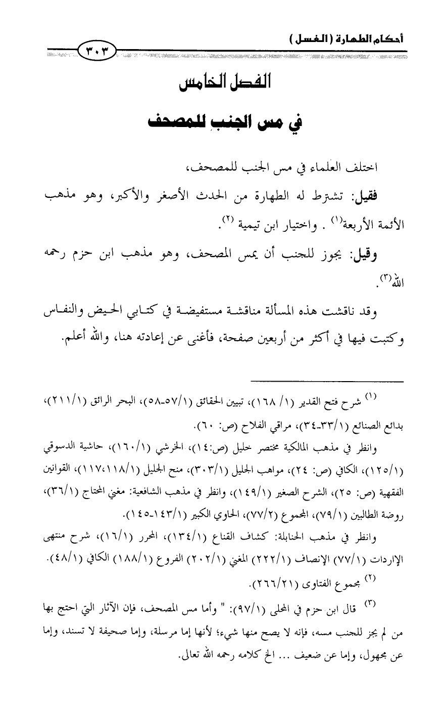 (¬٣) قال ابن حزم في المحلى (١/ ٩٧): " وأما مس المصحف، فإن الآثار التي احتج بها من لم يجز للجنب مسه، فإنه لا يصح منها شيء; لأنها إما مرسلة، وإما صحيفة لا تسند، وإما عن مجهول، وإما عن ضعيف ... الخ كلامه رحمه الله تعالى.