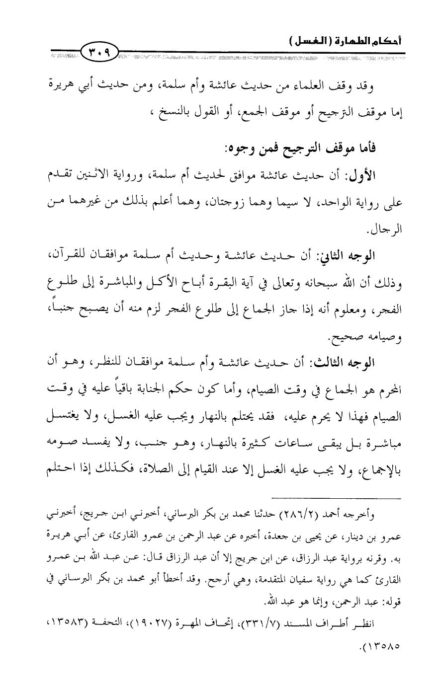 وقد وقف العلماء من حديث عائشة وأم سلمة، ومن حديث أبي هريرة إما موقف الترجيح أو موقف الجمع، أو القول بالنسخ،