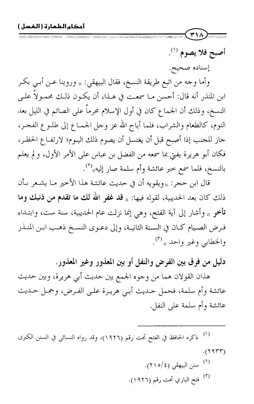 وأما وجه من اتبع طريقة النسخ، فقال البيهقي: «وروينا عن أبي بكر ابن المنذر أنه قال: أحسن ما سمعت في هذا، أن يكون ذلك محمولاً على النسخ، وذلك أن الجماع كان في أول الإسلام محرماً على الصائم في الليل بعد النوم، كالطعام والشراب، فلما أباح الله عز وجل الجماع إلى طلوع الفجر، جاز للجنب إذا أصبح قبل أن يغتسل أن يصوم ذلك اليوم؛ لارتفاع الحظر، فكان أبو هريرة يفتي بما سمعه من الفضل بن عباس على الأمر الأول، ولم يعلم بالنسخ، فلما سمع خبر عائشة وأم سلمة صار إليه» (¬٢).