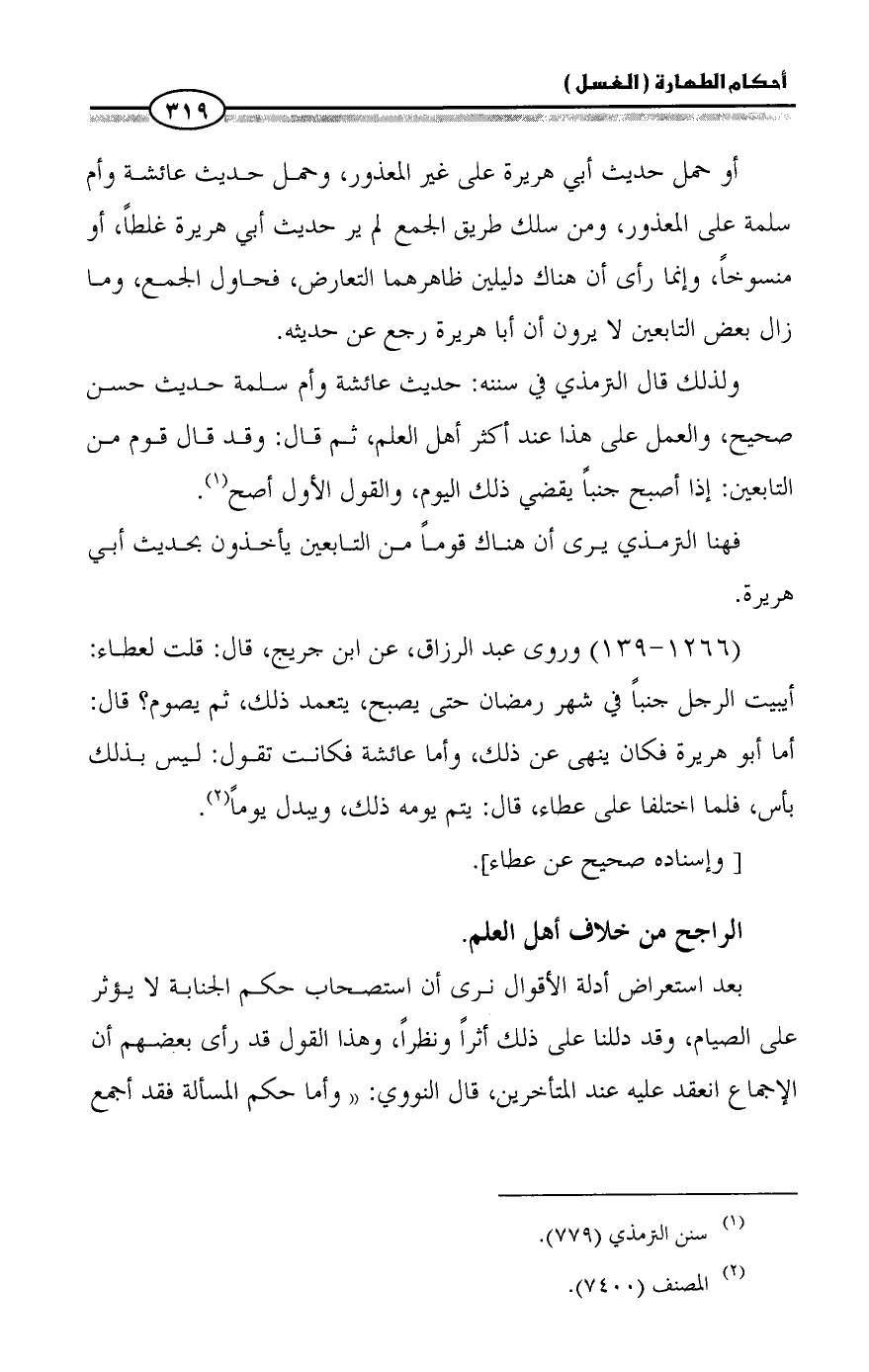 ولذلك قال الترمذي في سننه: حديث عائشة وأم سلمة حديث حسن صحيح، والعمل على هذا عند أكثر أهل العلم، ثم قال: وقد قال قوم من التابعين: إذا أصبح جنباً يقضي ذلك اليوم، والقول الأول أصح (¬١).